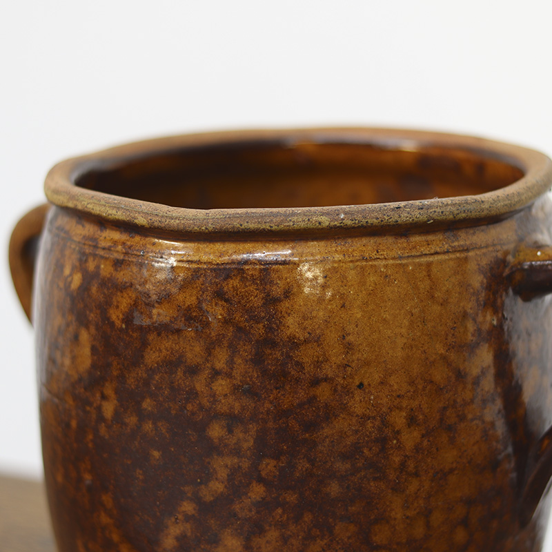 Deze prachtige aardewerken voorraad pot stamt uit het einde van de 19e eeuw en werd destijds gebruikt voor het conserveren en fermenteren van voedsel. De pot is met de handgemaakt en typerend voor die periode door de aardse kleuren en de eenvoudige, functionele vormgeving. Juist deze eenvoud geeft de pot een sterke, authentieke uitstraling.