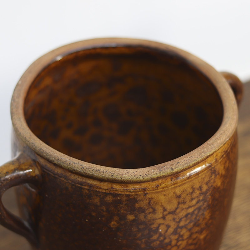 De pot heeft een schitterende bruin-oranje glazuurlaag, die de authentieke charme extra benadrukt. Enkel minimale gebruikers sporen zijn waar te nemen.