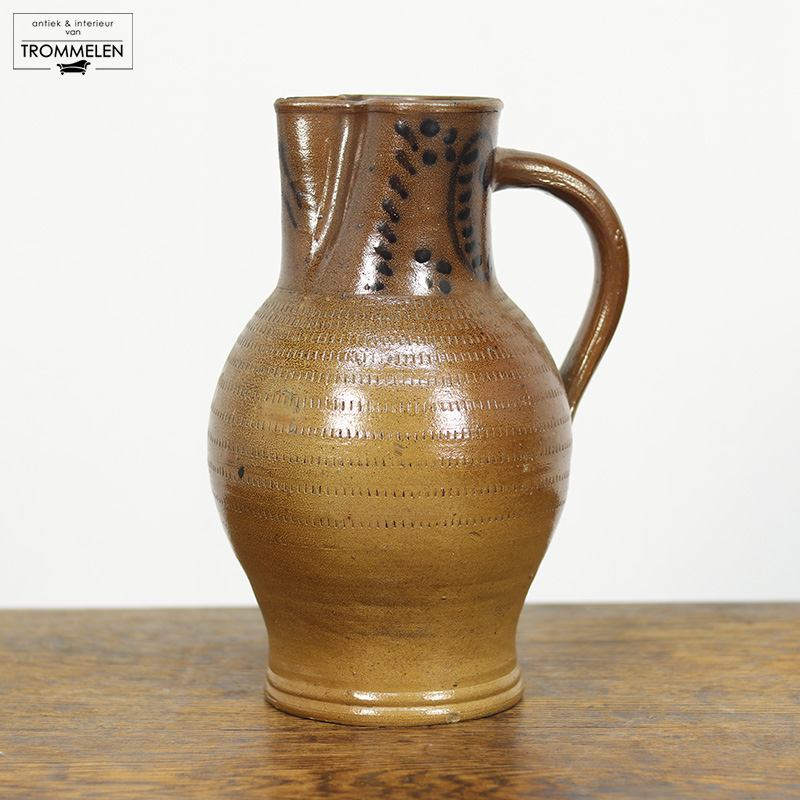 Deze prachtige aardewerken schenkkan stamt uit de 19e eeuw en is met de handgemaakt, voorzien van fijne versierde motieven die het karakter van het object subtiel benadrukken. Typisch voor die periode zijn de aardse kleur en de eenvoudige, functionele vormgeving. Juist deze eenvoud geeft de kan een sterke, authentieke uitstraling.