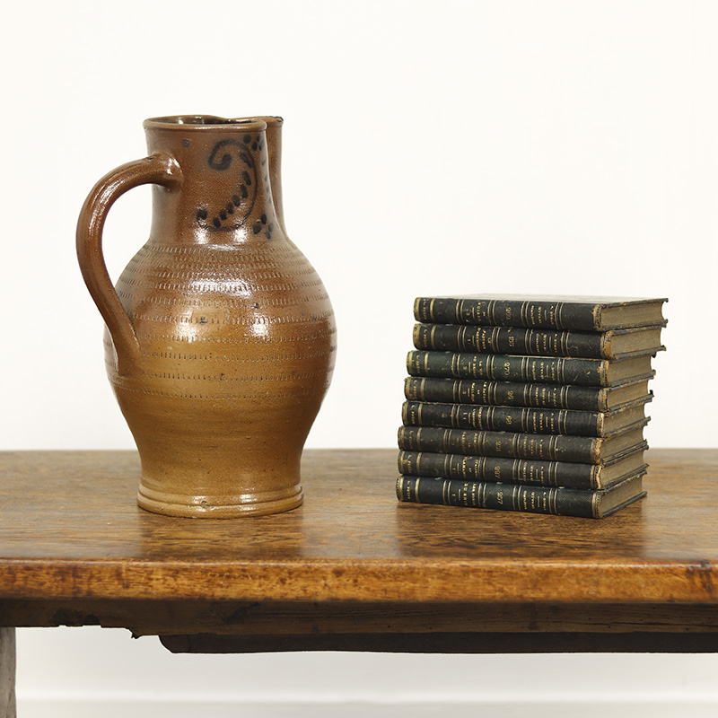 Dankzij zijn tijdloze vorm en decoratieve motieven is deze schenkkan perfect te gebruiken als vaas of als decoratief accent in een minimalistisch of landelijk geïnspireerd interieur. Herkomst Zuid-Duitsland.