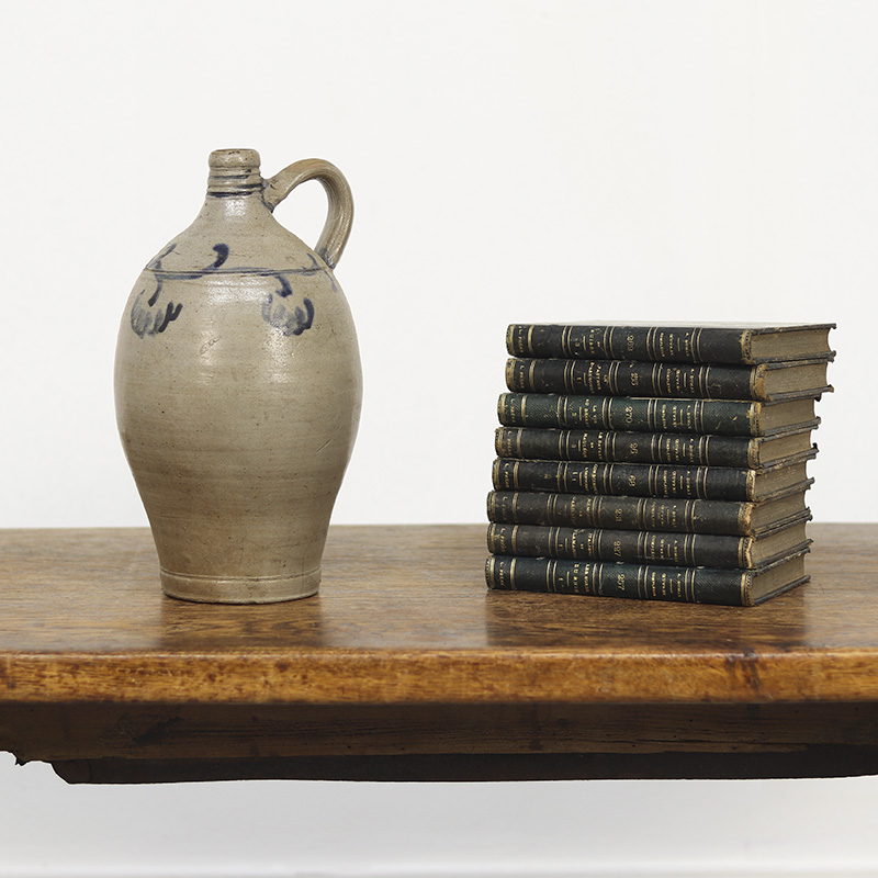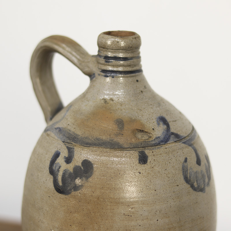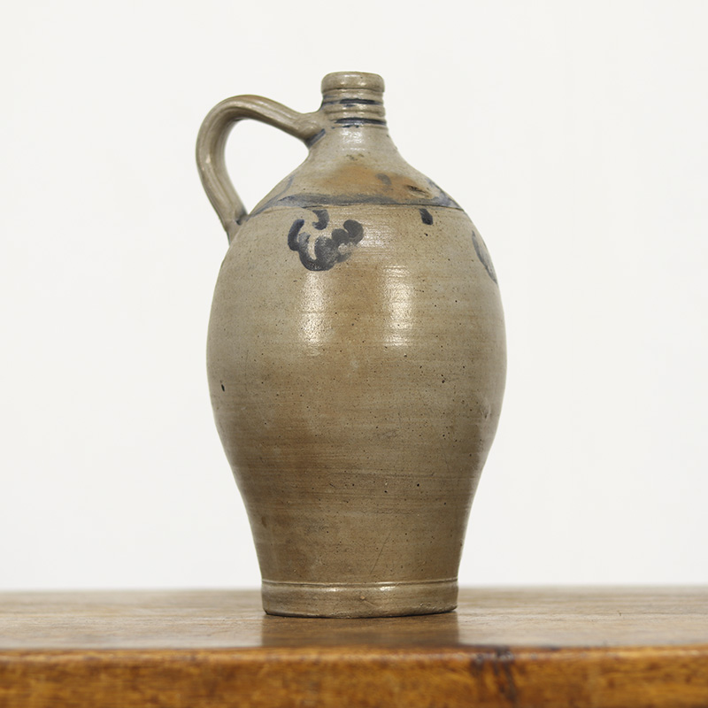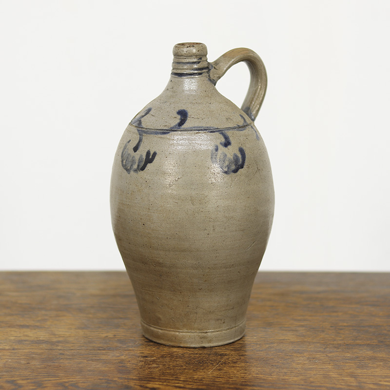 Deze prachtige decoratieve aardewerken schenkkan stamt uit Duitsland, midden 19e eeuw. De kan is uitgevoerd in een typische grijstint en voorzien van kobaltblauwe versieringen, met een eenvoudige en tijdloze vormgeving. Waarschijnlijk was de kan oorspronkelijk bedoeld als oliekan, wat typerend is voor dit type aardewerk.