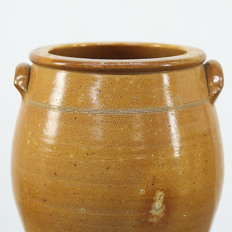 Deze prachtige aardewerken voorraadpot stamt uit het begin van de 20e eeuw en werd destijds gebruikt voor het conserveren en fermenteren van voedsel. De pot is met de hand gemaakt en heeft een bijzondere lichtbruine kleur met fijne spikkels, die zijn authentieke charme extra benadrukken. Er zijn slechts minimale gebruikssporen zichtbaar.