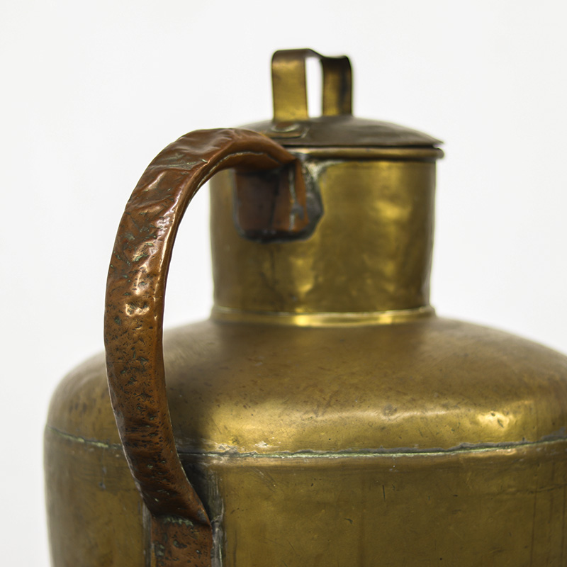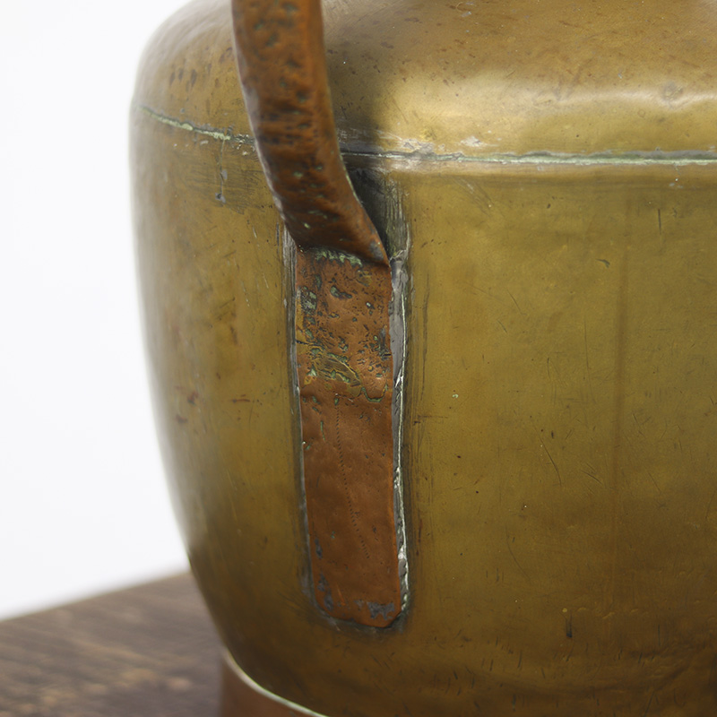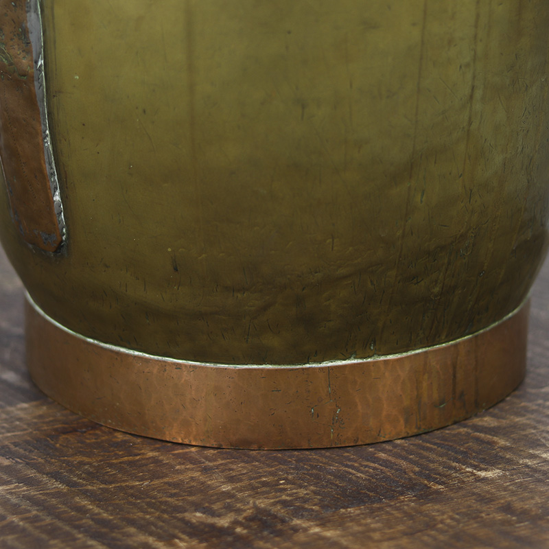 Deze bijzondere antieke Franse melkkan, ook wel canne à lait genoemd, werd in de 19e eeuw gebruikt voor het vervoer van melk van de boerderij naar huis of naar de markt. Het betreft een handgemaakt exemplaar, vervaardigd uit geel en roodkoper, en bovendien uitzonderlijk groot van formaat.