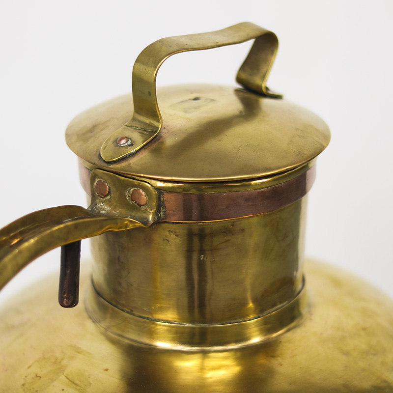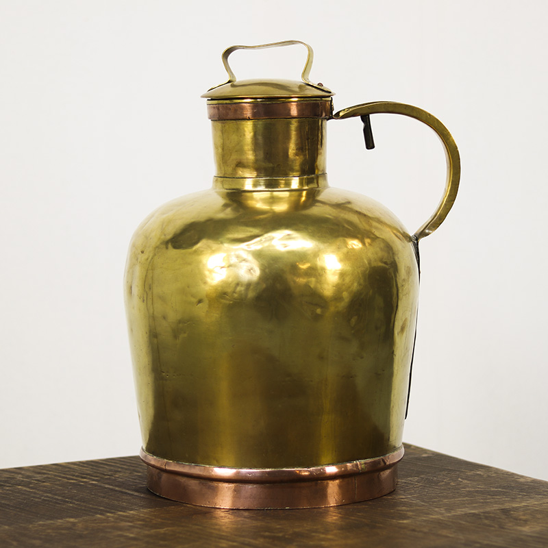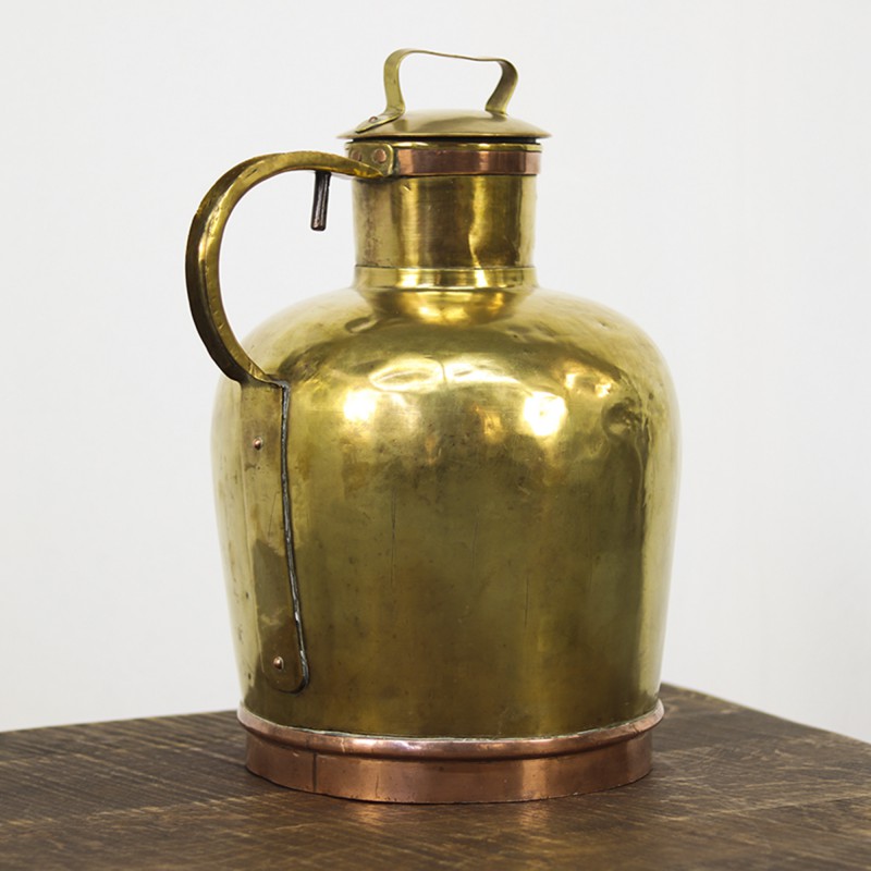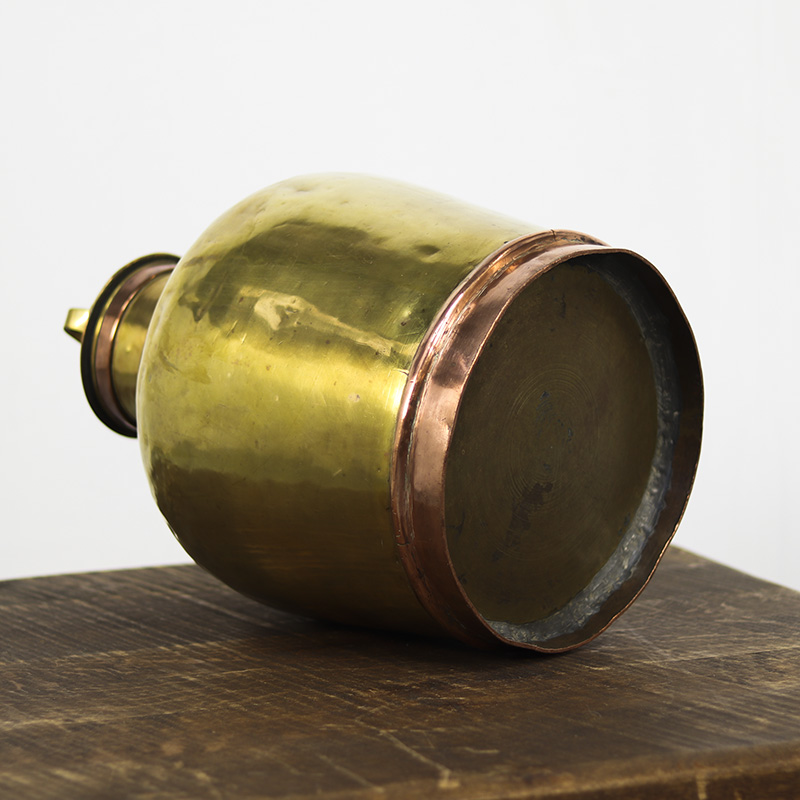 Deze bijzondere antieke Franse melkkan, ook wel canne à lait genoemd, werd in de 19e eeuw gebruikt voor het vervoer van melk van de boerderij naar huis of naar de markt. Het betreft een handgemaakt exemplaar, vervaardigd uit geel en roodkoper, en bovendien uitzonderlijk groot van formaat.