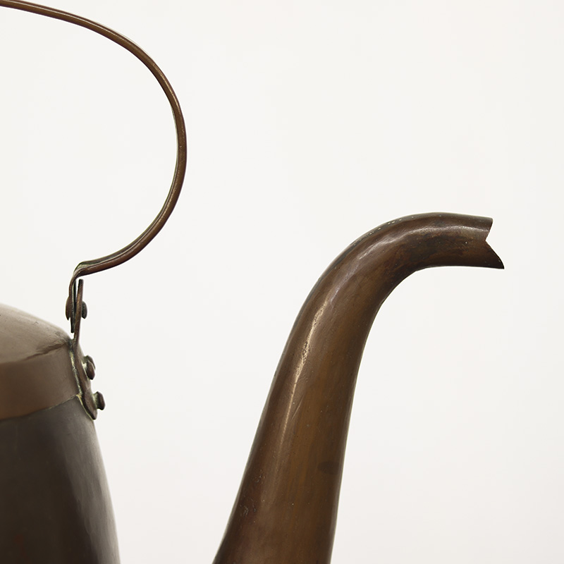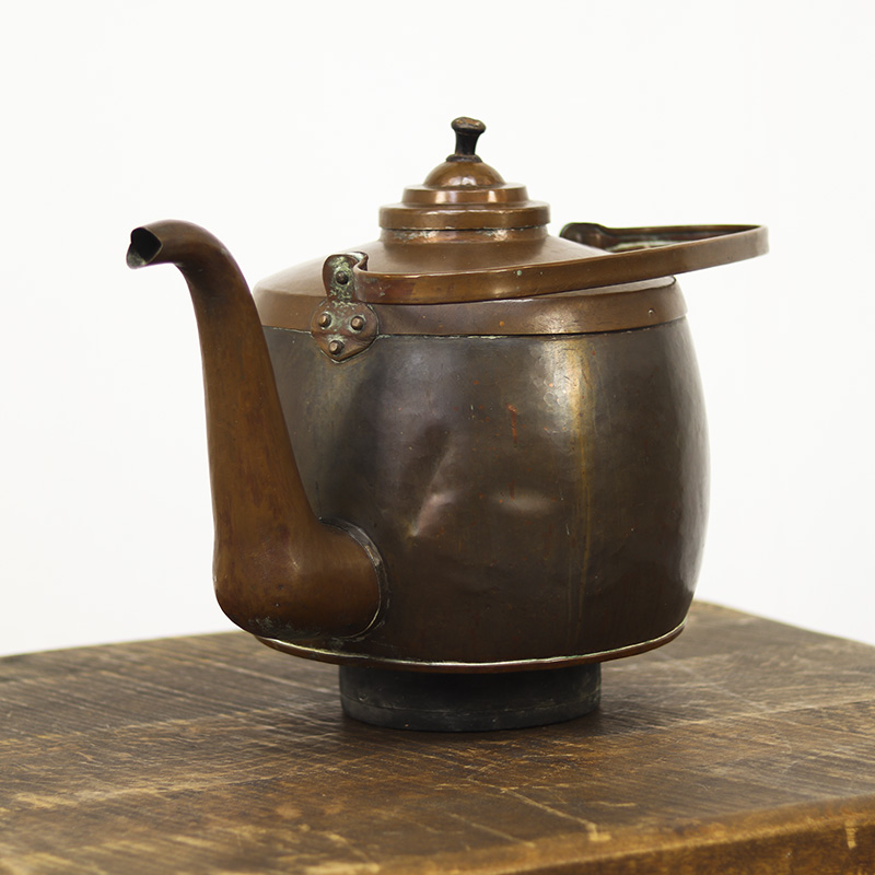 Uitzonderlijk grote roodkoperen theepot uit de 19e eeuw, met de hand bewerkt in hamerslag. De rijke, doorleefde patina is het resultaat van meer dan een eeuw gebruik en tijd. Een unieke eyecatcher dat direct karakter en warmte toevoegt aan je interieur.