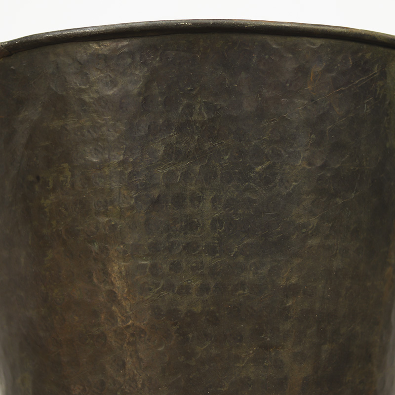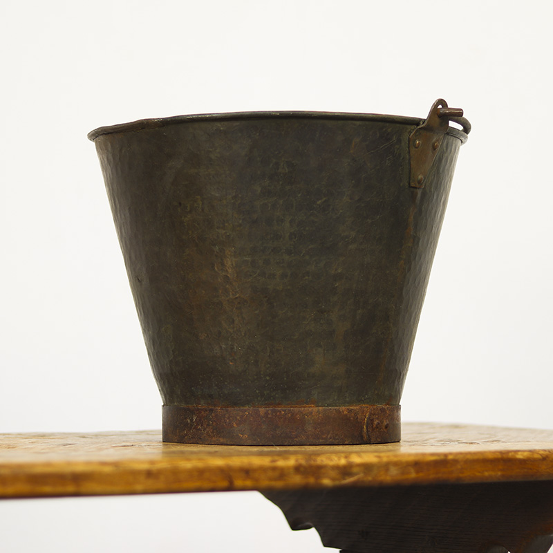 Unieke roodkoperen emmer met hamerslag en prachtige patina, ontstaan door een eeuw van gebruik. Groot exemplaar met karaktervolle uitstraling. De datering ligt in de 19e eeuw.