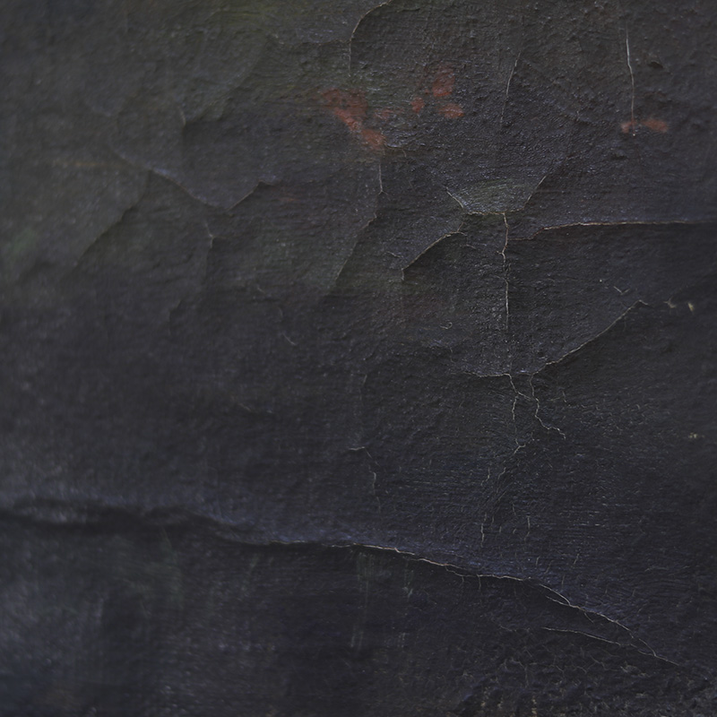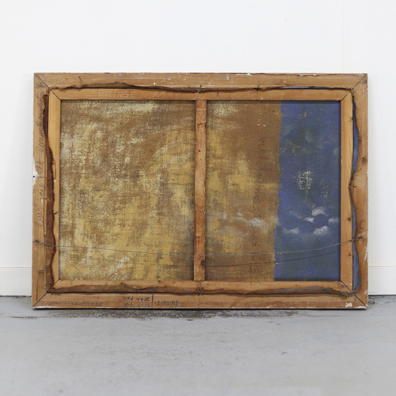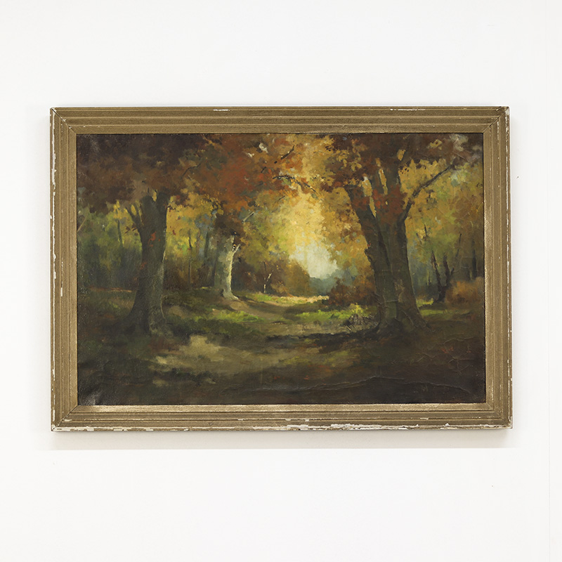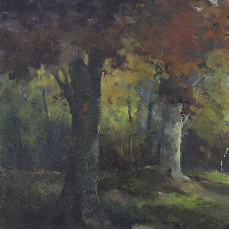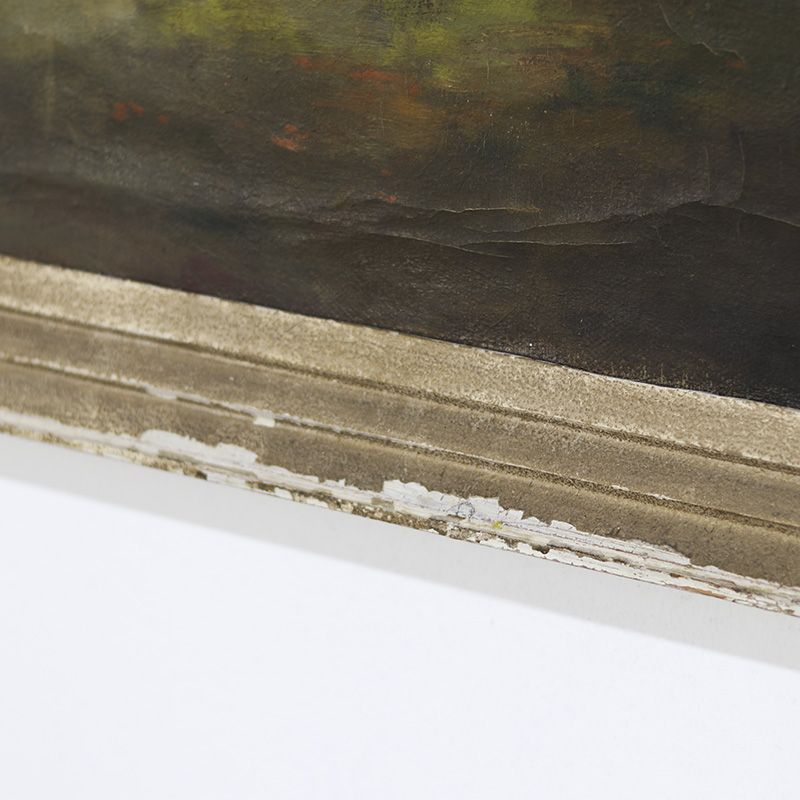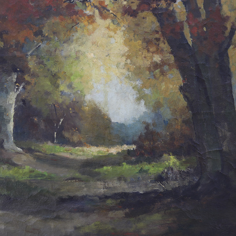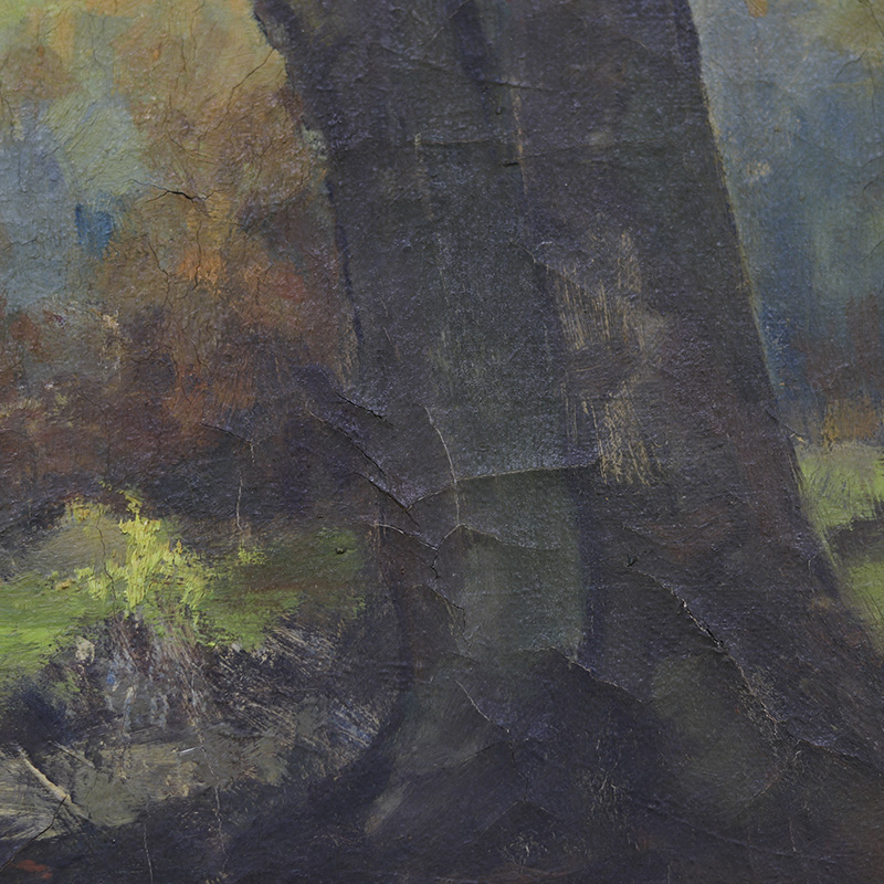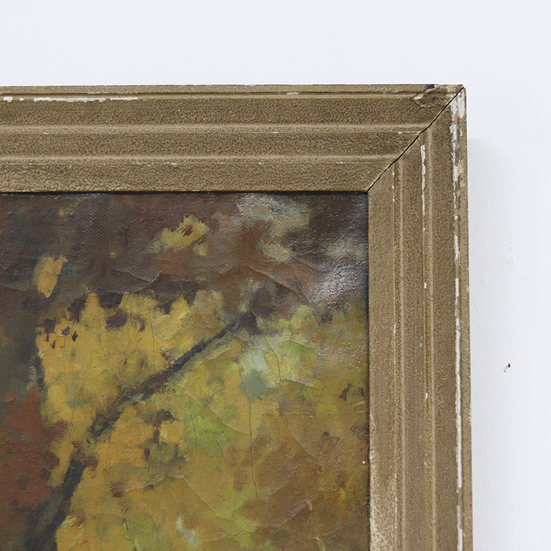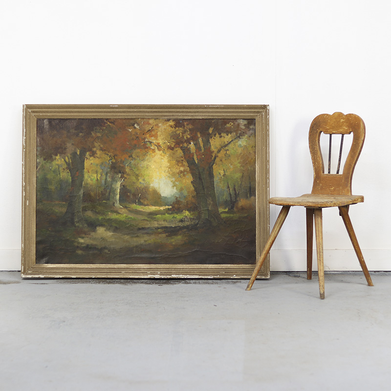 Imposant landschapsschilderij uitgevoerd in olieverf op doek. Het werk toont een weids en sfeervol landschap met sprekende kleuren. De oude verf is tamelijk gesleten en toont een decoratief craquelé. De datering ligt om en nabij in de jaren 1940. Tamelijk groot formaat.
