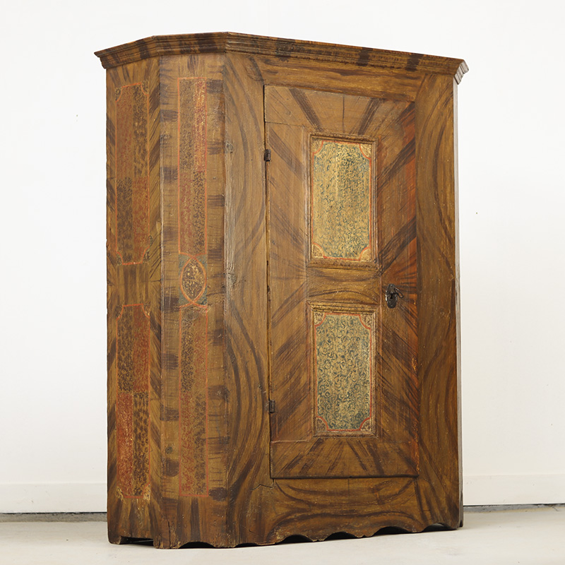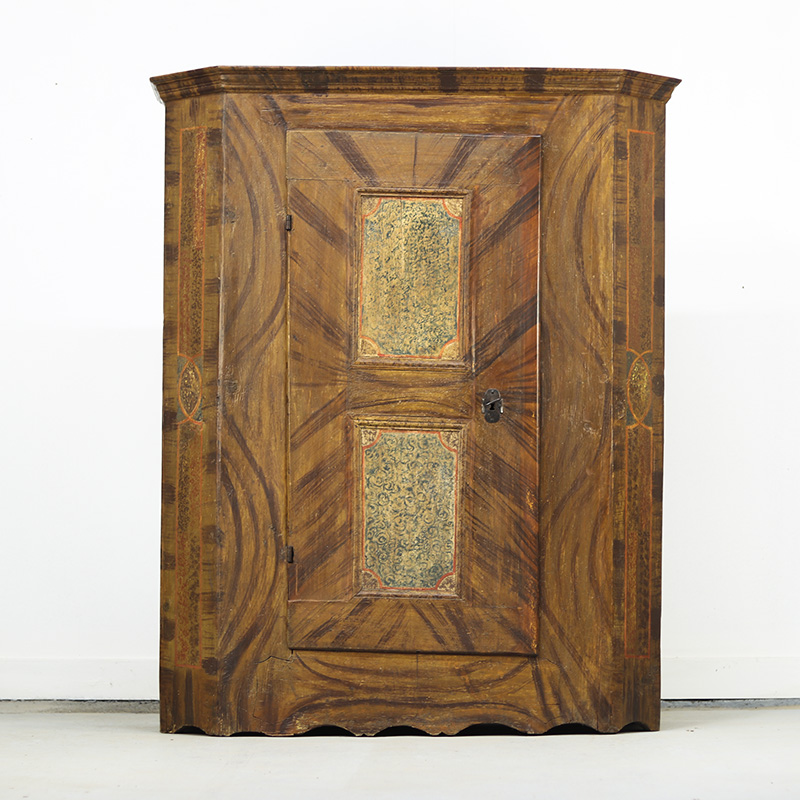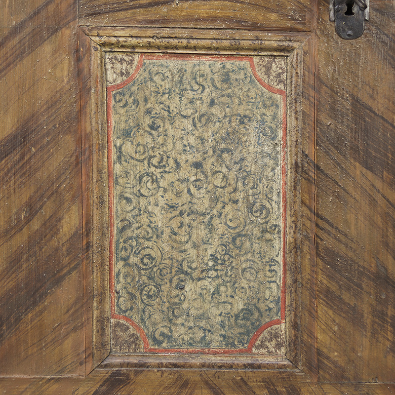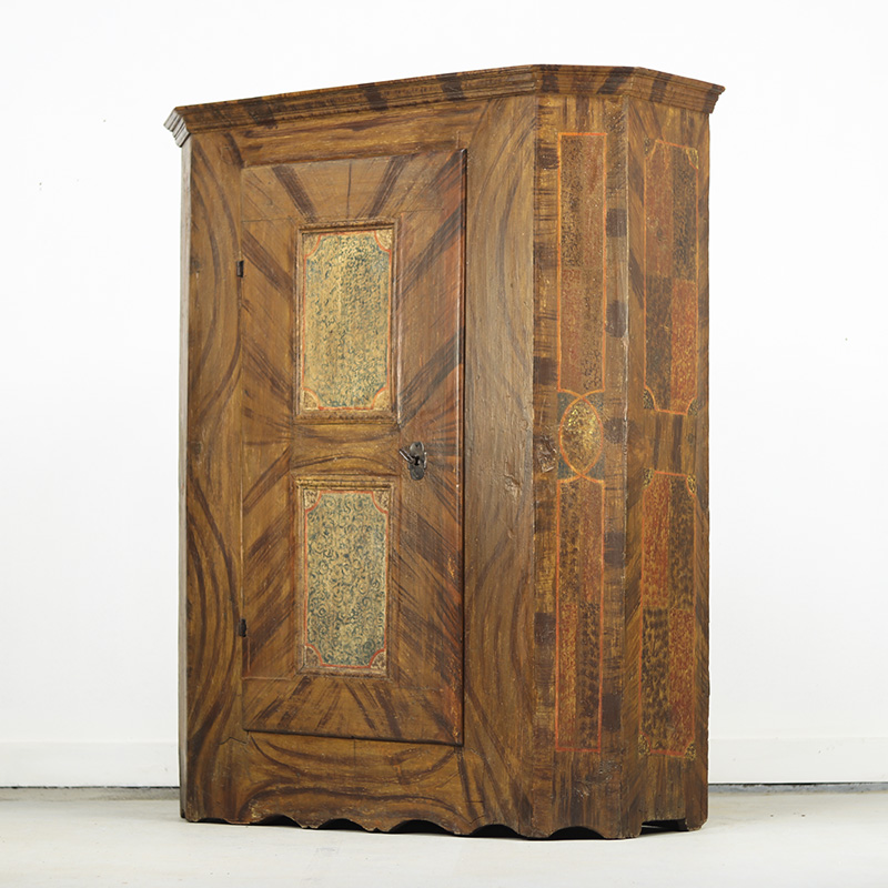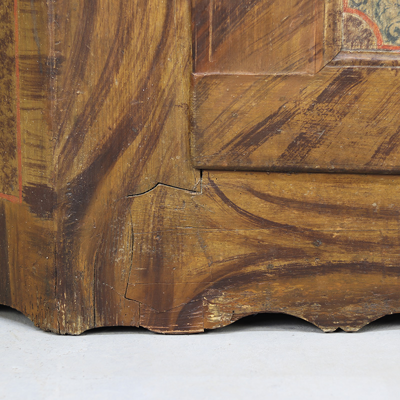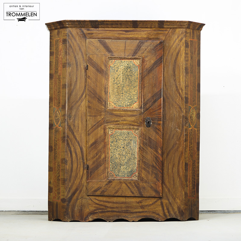 Buitengewone antieke bruidskast, persoonlijk een van mijn favorieten die we momenteel aanbieden. Ondanks dat deze kast niet gedateerd is kunnen we er rustig vanuit gaan dat het meubelstuk omstreeks 1750 vervaardigd is en wel in de Noordoostelijke Oberpfalz / Egerland. De vormgeving is zeer primitief en eenvoudig, zo ook de beschildering. De panelen zijn met een lichtblauw motief versierd, en de kast zelf staat in de originele Faux-Bois beschildering. De kast is vervaardigd uit bijzonder dikke planken grenenhout en het geheel is dan ook van tamelijk zware kwaliteit. Uiteraard zijn er lichte gebruikers sporen waar te nemen, al verkeert de kast voor zijn leeftijd nog in een verbazingwekkend goede staat. Op de deur zijn enkele oude reparaties waar te nemen maar verder valt er weinig op te merken. De kast heeft nog het originele werkende slot met sleutel en ook de indeling van de kast is in 275 jaar tijd onveranderd gebleven. Vroeger was het gewoonte om bruidsmeubelen als deze bij een trouwerij cadeau te geven aan het echtpaar. Deze meubelen werden naderhand op de boerderij in een pronkkamer geplaatst die enkel zelden gebruikt werd bij hoog bezoek of speciale gelegenheden. Een prachtig en decoratief stuk geschiedenis dus.