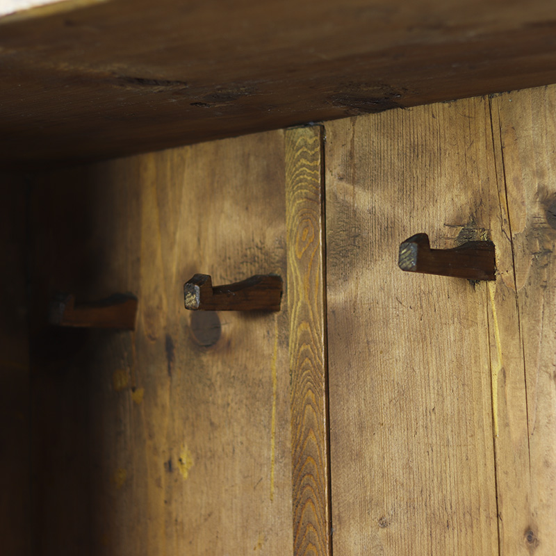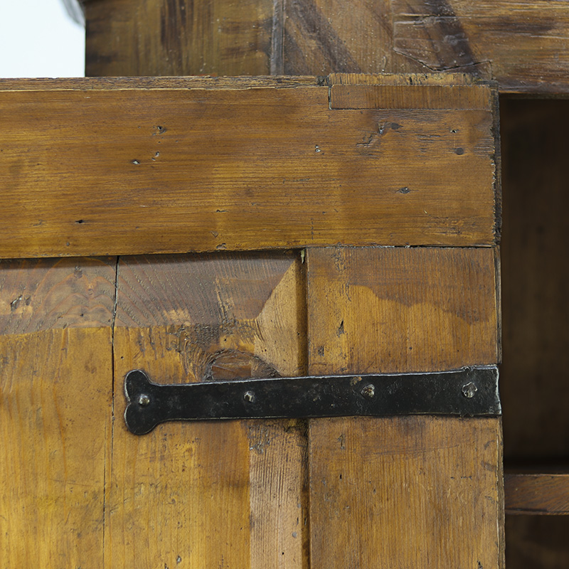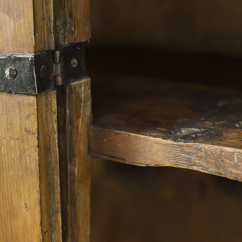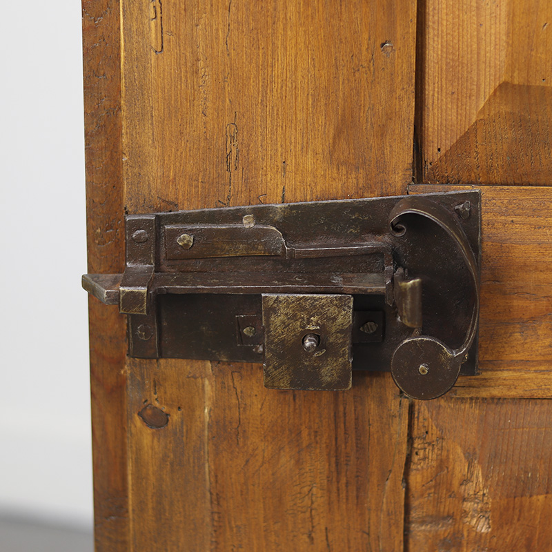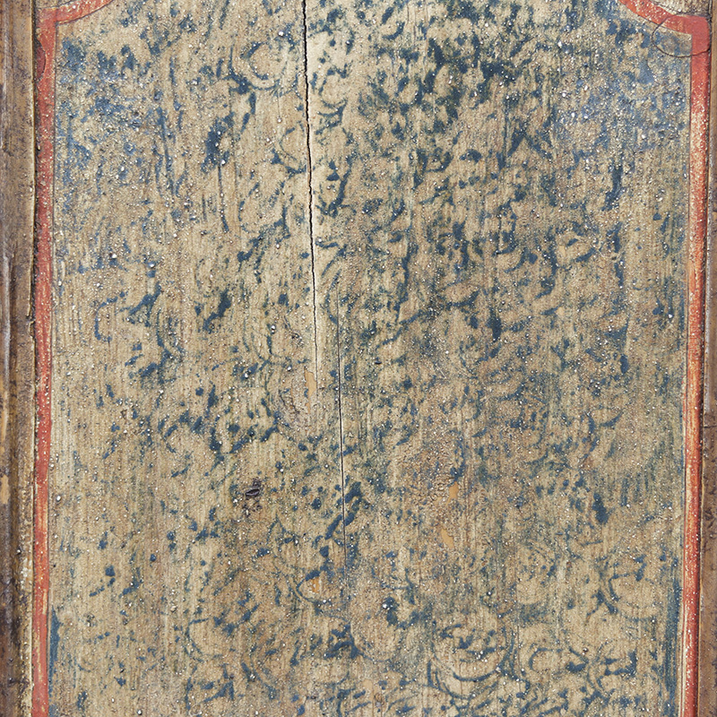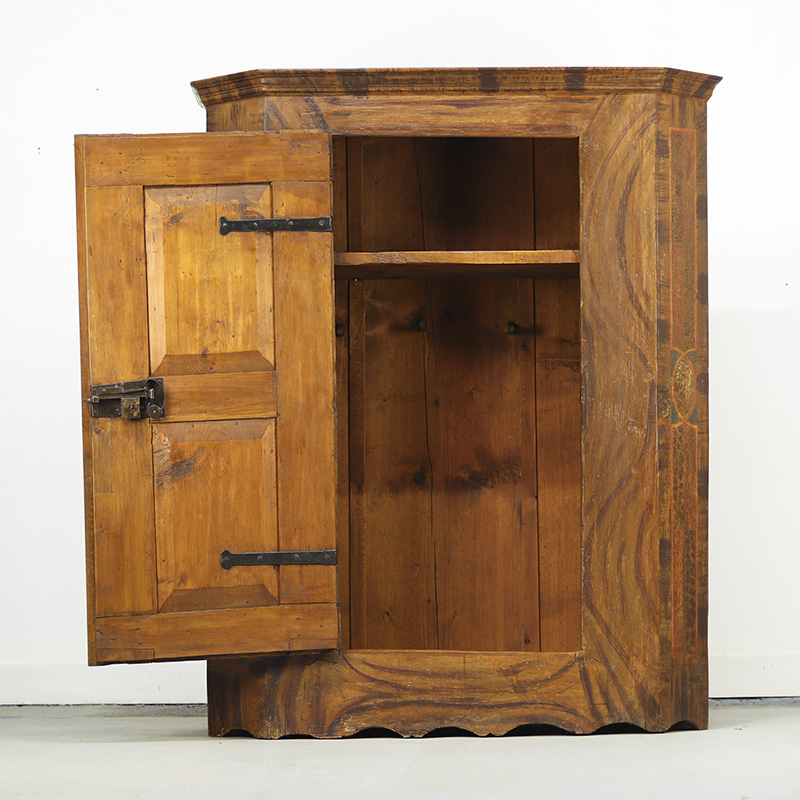 Buitengewone antieke bruidskast, persoonlijk een van mijn favorieten die we momenteel aanbieden. Ondanks dat deze kast niet gedateerd is kunnen we er rustig vanuit gaan dat het meubelstuk omstreeks 1750 vervaardigd is en wel in de Noordoostelijke Oberpfalz / Egerland. De vormgeving is zeer primitief en eenvoudig, zo ook de beschildering. De panelen zijn met een lichtblauw motief versierd, en de kast zelf staat in de originele Faux-Bois beschildering. De kast is vervaardigd uit bijzonder dikke planken grenenhout en het geheel is dan ook van tamelijk zware kwaliteit. Uiteraard zijn er lichte gebruikers sporen waar te nemen, al verkeert de kast voor zijn leeftijd nog in een verbazingwekkend goede staat. Op de deur zijn enkele oude reparaties waar te nemen maar verder valt er weinig op te merken. De kast heeft nog het originele werkende slot met sleutel en ook de indeling van de kast is in 275 jaar tijd onveranderd gebleven. Vroeger was het gewoonte om bruidsmeubelen als deze bij een trouwerij cadeau te geven aan het echtpaar. Deze meubelen werden naderhand op de boerderij in een pronkkamer geplaatst die enkel zelden gebruikt werd bij hoog bezoek of speciale gelegenheden. Een prachtig en decoratief stuk geschiedenis dus.