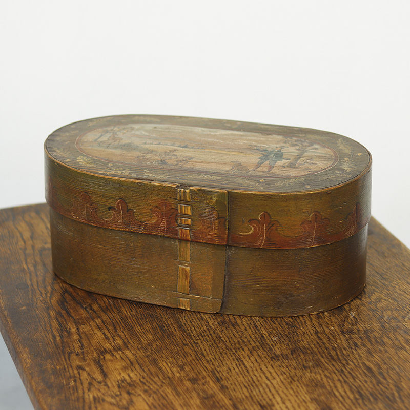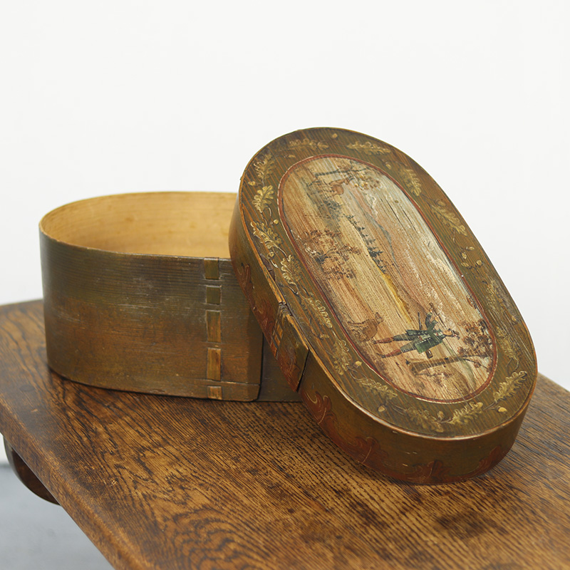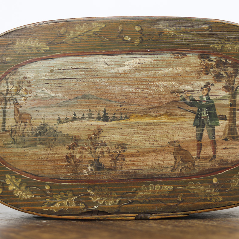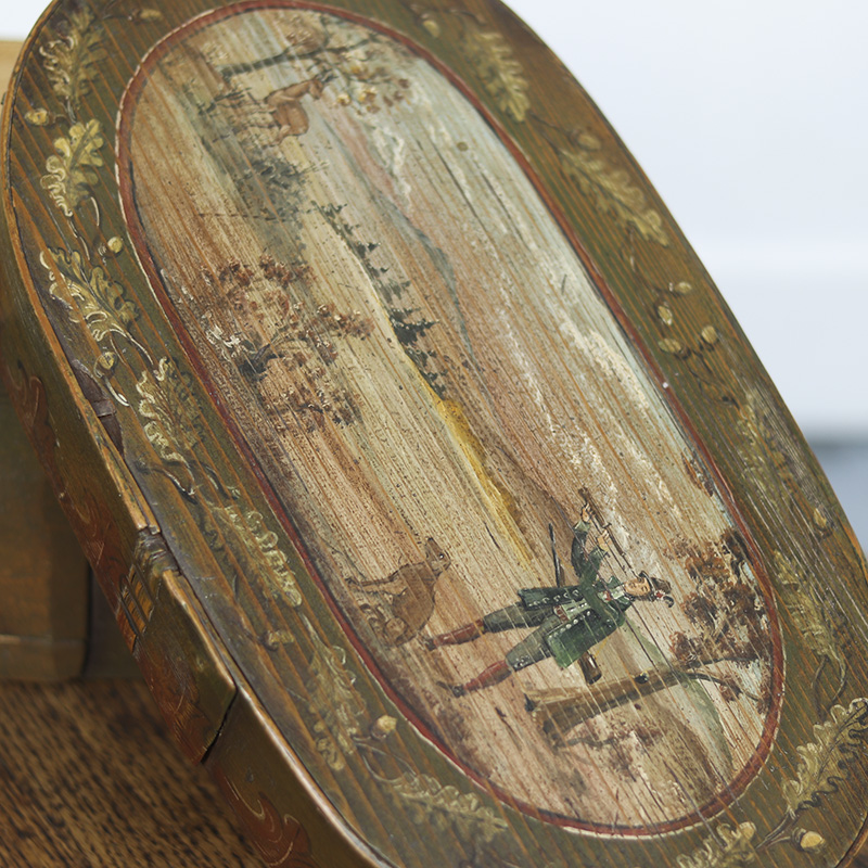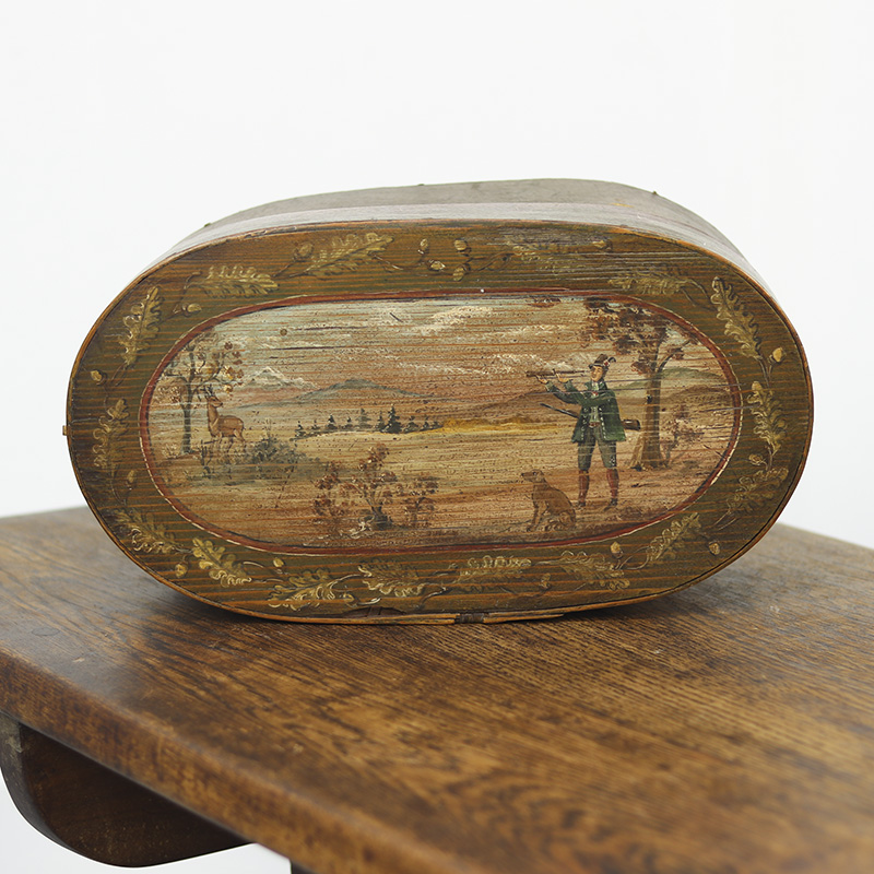 Prachtige antieke gebogen houten doos uit de 19e eeuw, afkomstig uit Zuid-Duitsland. De doos is rijkelijk versierd met volkskunstachtige beschilderingen in een levendig jachttafereel, wat het een uniek decoratief karakter geeft. Vervaardigd van gebogen beukenhout, een authentiek stukje vakmanschap uit die tijd.
