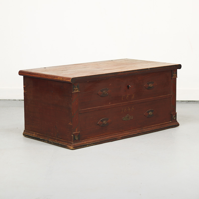 Beschilderde Zweedse volkskunst kist, daterend uit 1845. De kist is beschilderd met een warme ossenbloedrode kleur en versierd met decoratieve accenten van latoenkoper. De verf vertoont een fraaie, doorleefde slijtage die bijdraagt aan het historische karakter. Lichte gebruikssporen passend bij de leeftijd zijn aanwezig. Eén sleutelplaat ontbreekt. Het interieur is praktisch ingedeeld met een opbergvak en twee lades.
