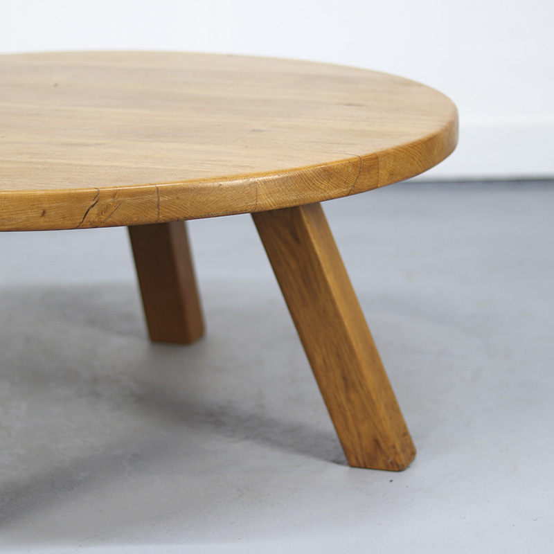 Deze grote, ronde salontafel uit de jaren 1960 is vervaardigd in Brutalistische stijl en gemaakt van zwaar eikenhout van hoge kwaliteit. Het hout vertoont een fraai patina en lichte gebruikers sporen, die het meubel een warme uitstraling geven. Dit meubelstuk is veelzijdig te gebruiken en past zowel in een landelijk, antiek als modern interieur.