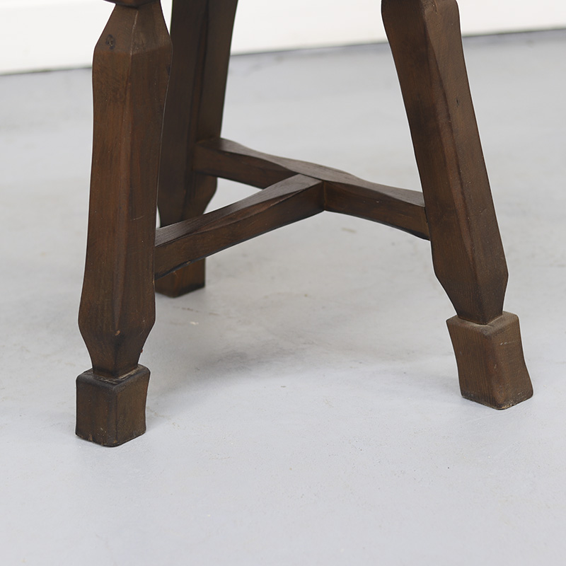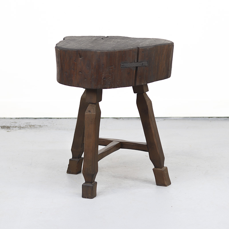 Groot, authentiek eikenhouten hakblok uit Frankrijk met een prachtige, doorleefde uitstraling. Het donkergekleurde eikenhout toont volop karakter en gebruikssporen die bijdragen aan de charme van het stuk. Het blok staat op een decoratief onderstel, wat het geheel een stijlvol en robuust karakter geeft.