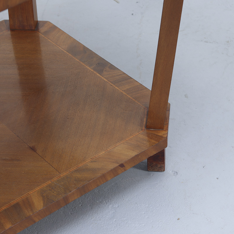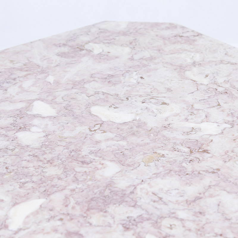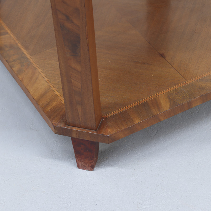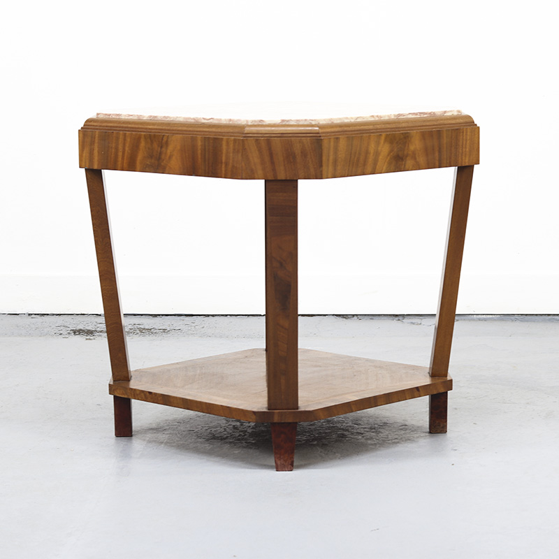 Franse Art-Deco tafel uit de jaren 1930, afgewerkt met prachtig ingelegd mahoniefineer en een roze marmeren blad. Lichte gebruikssporen aanwezig, waaronder enkele kleine gerepareerde stukjes fineer op de voet. Een stijlvol en karaktervol stuk uit de Art-Deco periode.