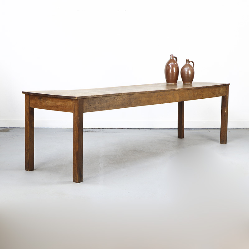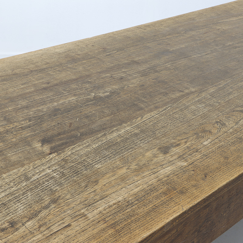 Zeer lange eettafel van massief eikenhout, daterend uit de jaren 1930. Eenvoudig en tijdloos ontwerp met een rustige, authentieke uitstraling. In goede staat met minimale, bij de leeftijd passende gebruikssporen.