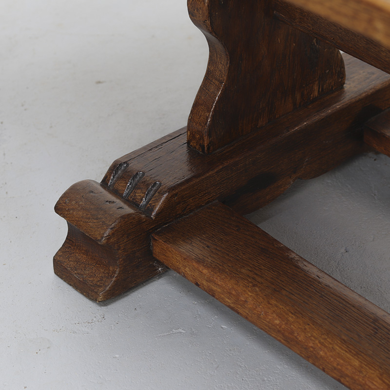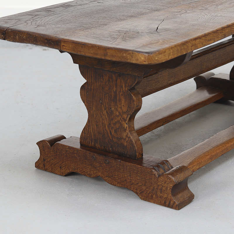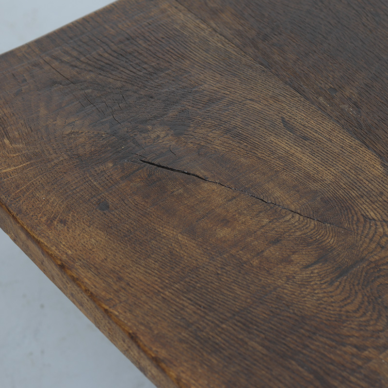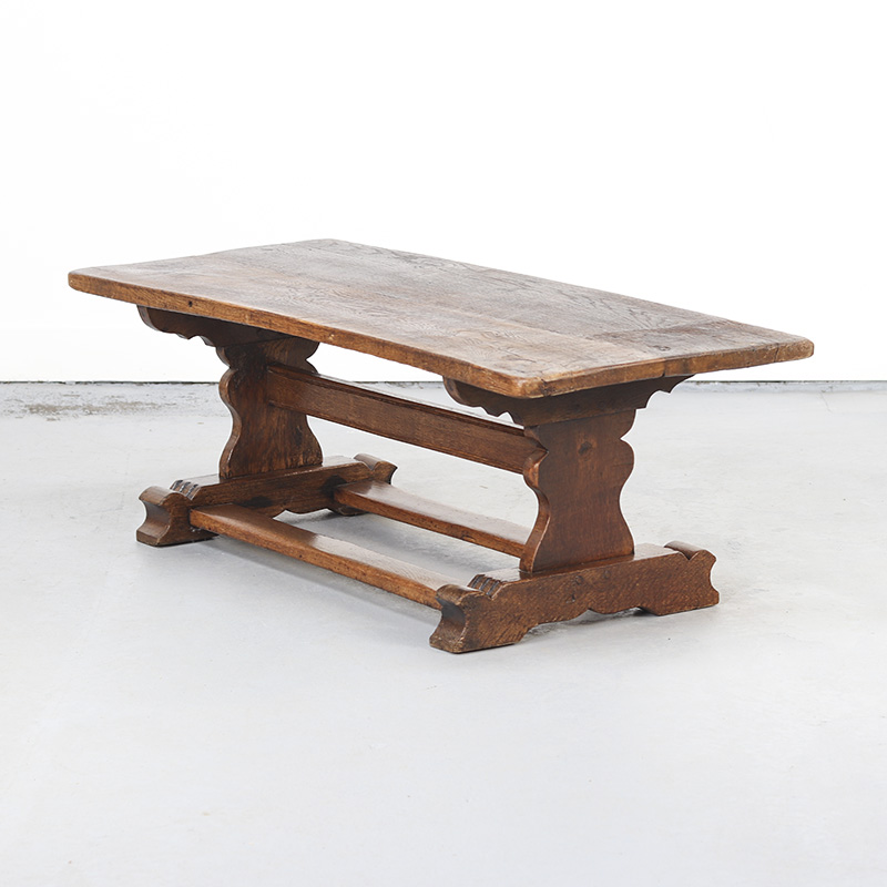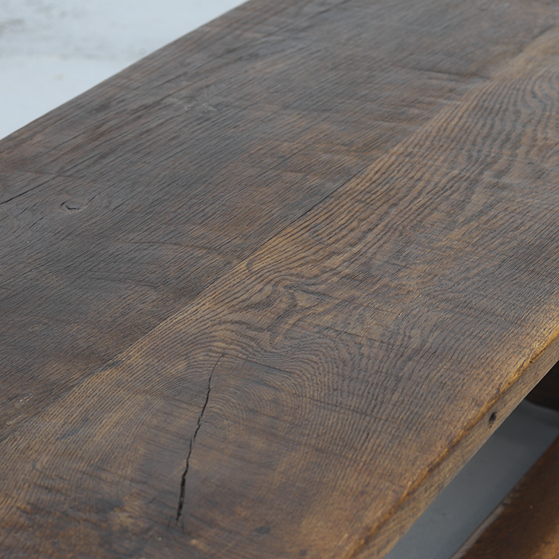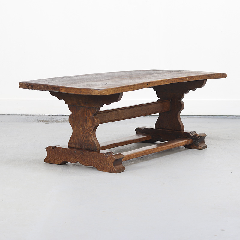 Robuuste salontafel van massief, dik eikenhout. De tafel is vervaardigd in de jaren ’70 in authentieke 18e-eeuwse stijl, voor het blad is dan ook origineel hout uit deze periode gebruikt. De traditionele pen-en-gatverbindingen en de mooie, decoratieve houtnerf geven de tafel een warm en karaktervol uiterlijk. Perfect passend in een antiek of landelijk interieur.