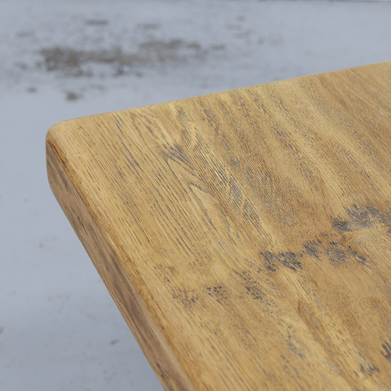Deze grote, vierkante salontafel uit de jaren 1960 is vervaardigd in Brutalistische stijl en gemaakt van zwaar eikenhout. Het hout vertoont karakteristieke gebruikers sporen, die het meubel een warme uitstraling geven. Dit meubelstuk is veelzijdig te gebruiken en past zowel in een landelijk, antiek als modern interieur.