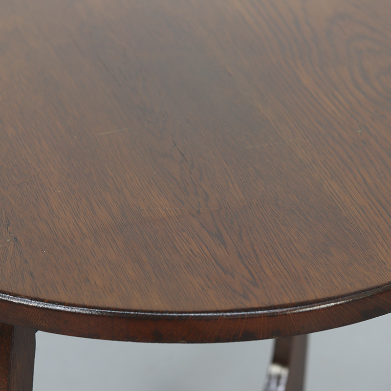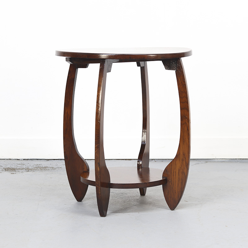 Art Deco bijzettafel van eikenhout, daterend uit de jaren 1930. Bijzondere organische vormgeving met een decoratieve uitstraling. De tafel is afgewerkt met een hoogglans lak. In goede staat met lichte, bij de leeftijd passende gebruikssporen.