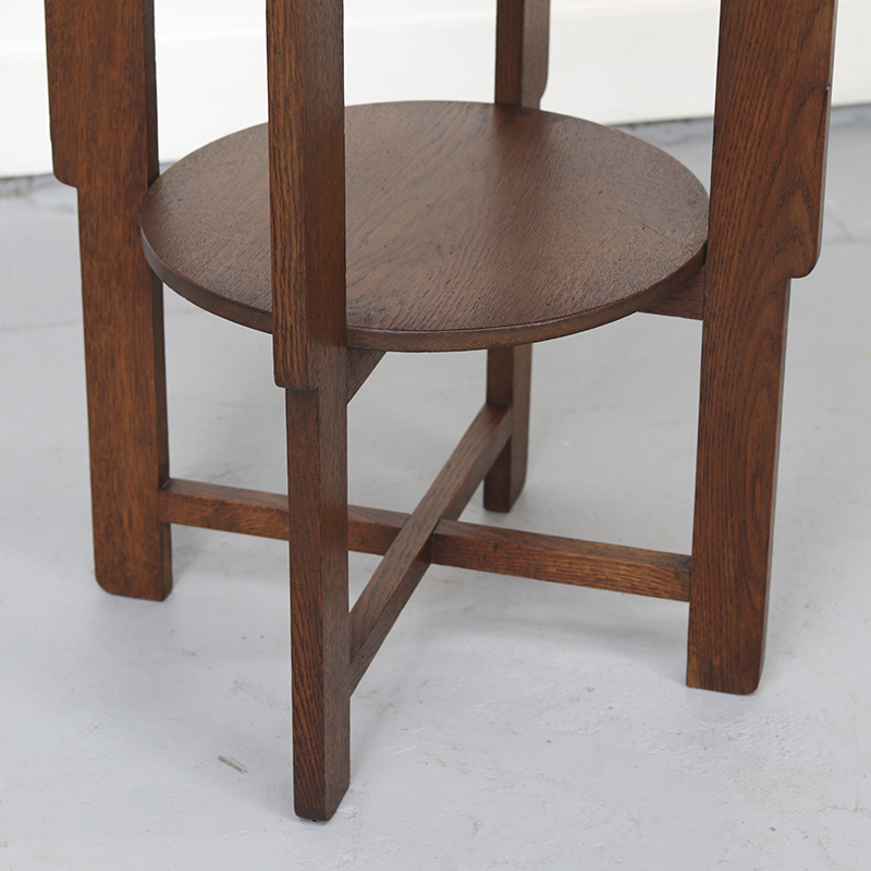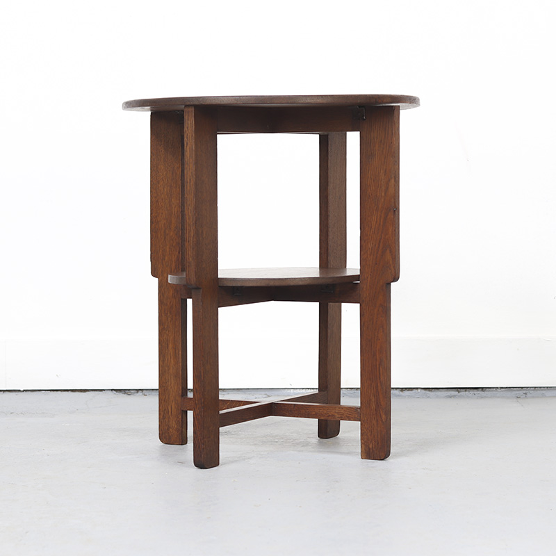 Bijzondere Art-Deco bijzettafel uit de jaren 1930 van massief eikenhout. De tafel heeft en sierlijk onderstel en een elegante en tijdloze uitstraling. In goede staat met lichte, bij de leeftijd passende gebruikssporen.
