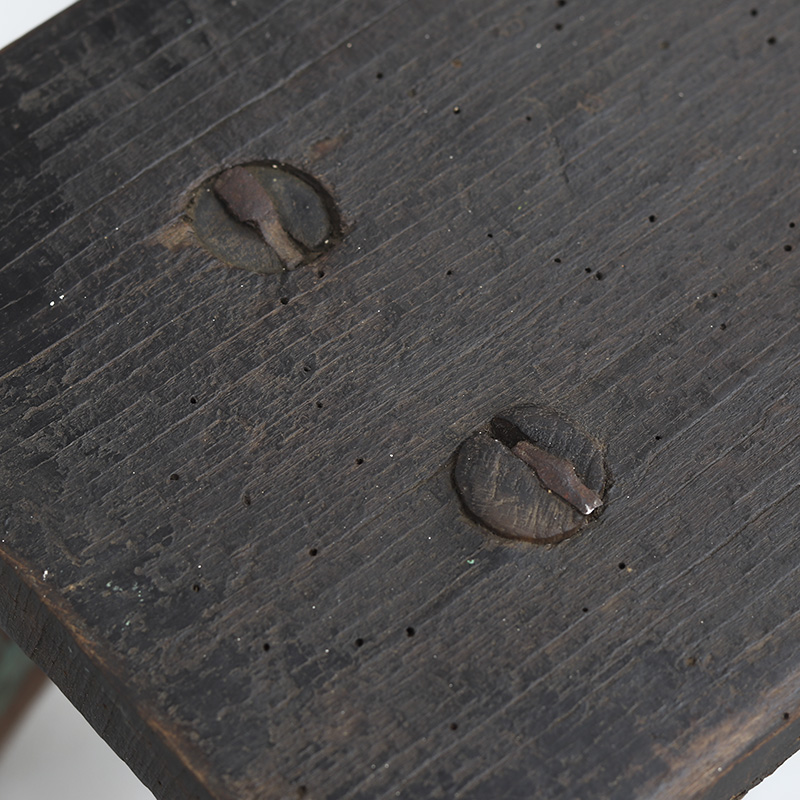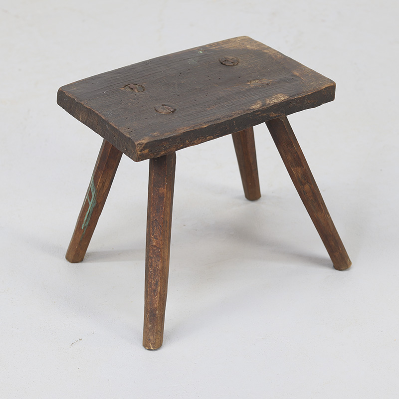 Deze primitieve grenenhouten kruk, ooit puur functioneel vervaardigd om op te zitten, is tegenwoordig uitgegroeid tot een opvallend stijlvol en karaktervol object. De kruk is gemaakt van stevig grenenhout en heeft een zwaar gepatineerd en doorleefd karakter. Sporadisch aanwezige houtworm sporen zijn nagelopen en behandeld.