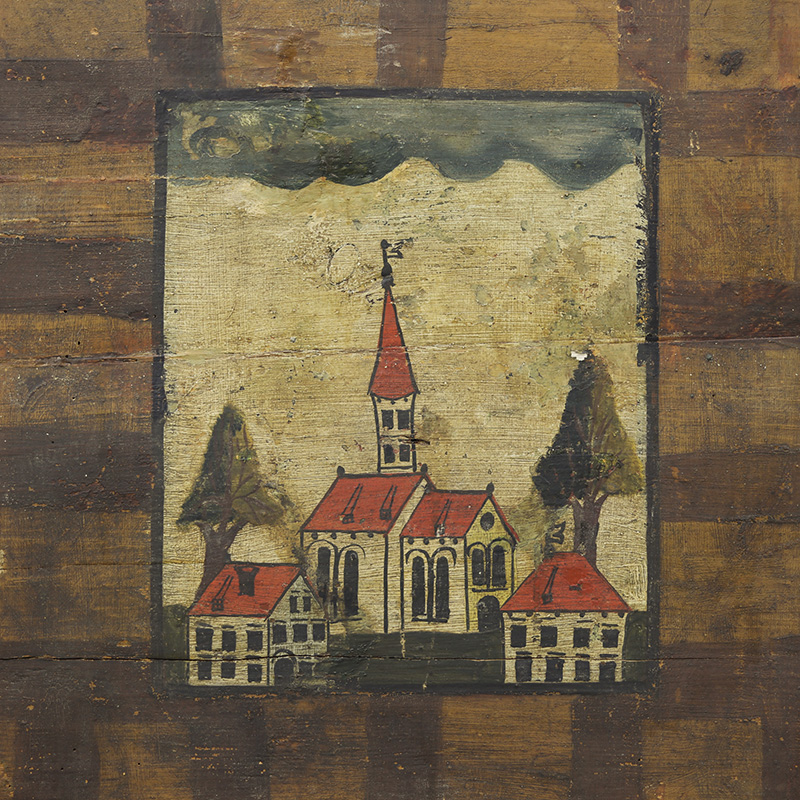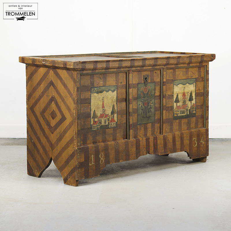 Primitief versierde / beschilderde bruidskist uit Duitsland, om precies te zijn uit Mittel-Franken. De kist heeft een zeer rustieke uitstraling en toont volop karakter. Het geheel is met een streepmotief versierd en de panelen aan de voorzijde zijn versierd met dorpstaferelen en tulpen. De kist verkeert in een nette, maar gebruikte staat. Zo zijn er sporadisch wat oude houtworm sporen waar te nemen, welke uiteraard zijn nagelopen en behandeld. Vroeger was het gewoonte om bruidsmeubelen als deze bij een trouwerij cadeau te geven aan het echtpaar. Deze meubelen werden naderhand op de boerderij in een pronkkamer geplaatst die enkel zelden gebruikt werd bij hoog bezoek of speciale gelegenheden. Een prachtig en decoratief stuk geschiedenis dus. Dit exemplaar dateert uit 1834.