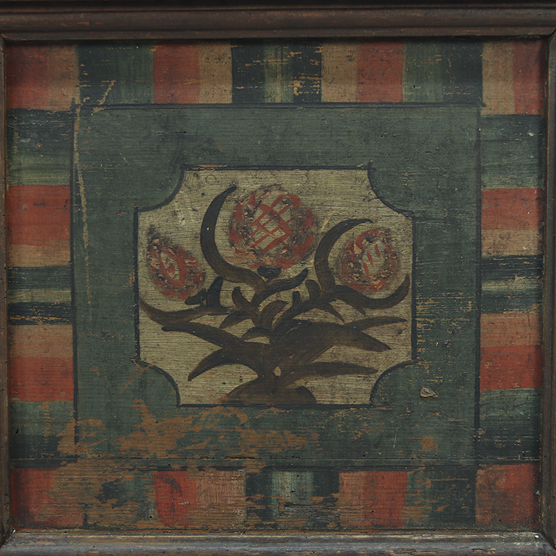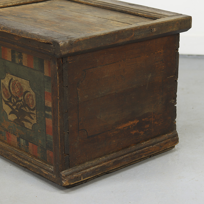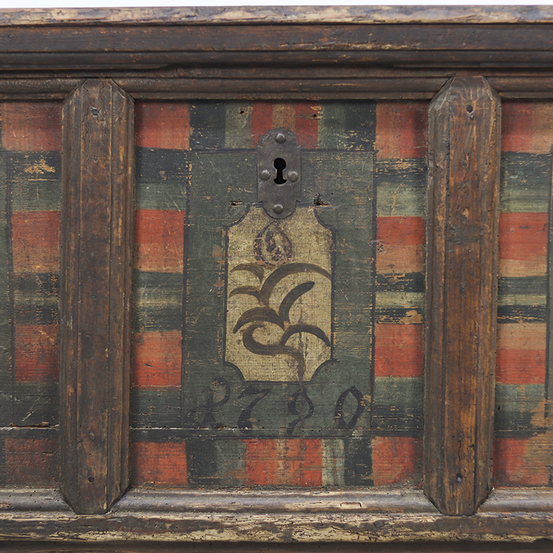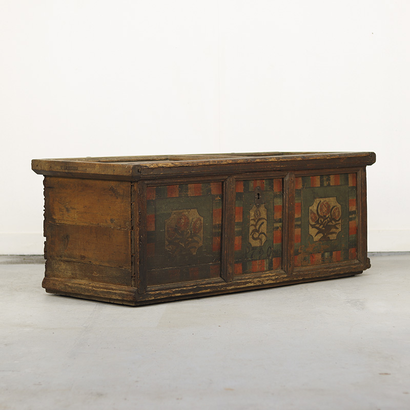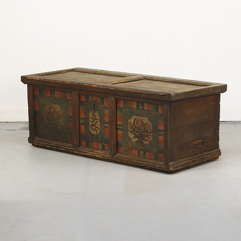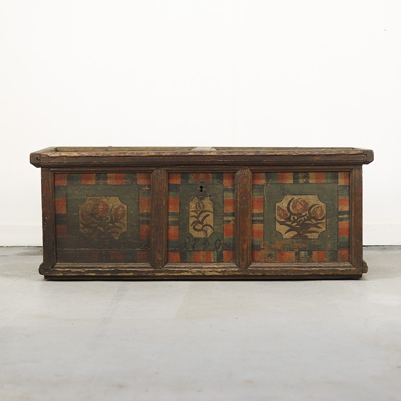 Grote en verweerde beschilderde bruidskist uit Zuid-Duitsland. De kist heeft een zeer rustieke uitstraling en toont volop karakter. Het geheel is primair in groene en rode kleuren beschilderd met florale versieringen in de panelen. De verf is tamelijk gesleten wat het geheel een uiterst decoratieve uitstraling geeft. De kist verkeert in een nette, maar gebruikte staat. Zo zijn er sporadisch wat oude houtworm sporen waar te nemen, welke uiteraard zijn nagelopen en behandeld. Vroeger was het gewoonte om bruidsmeubelen als deze bij een trouwerij cadeau te geven aan het echtpaar. Deze meubelen werden naderhand op de boerderij in een pronkkamer geplaatst die enkel zelden gebruikt werd bij hoog bezoek of speciale gelegenheden. Een prachtig en decoratief stuk geschiedenis dus. Dit exemplaar dateert uit 1790.