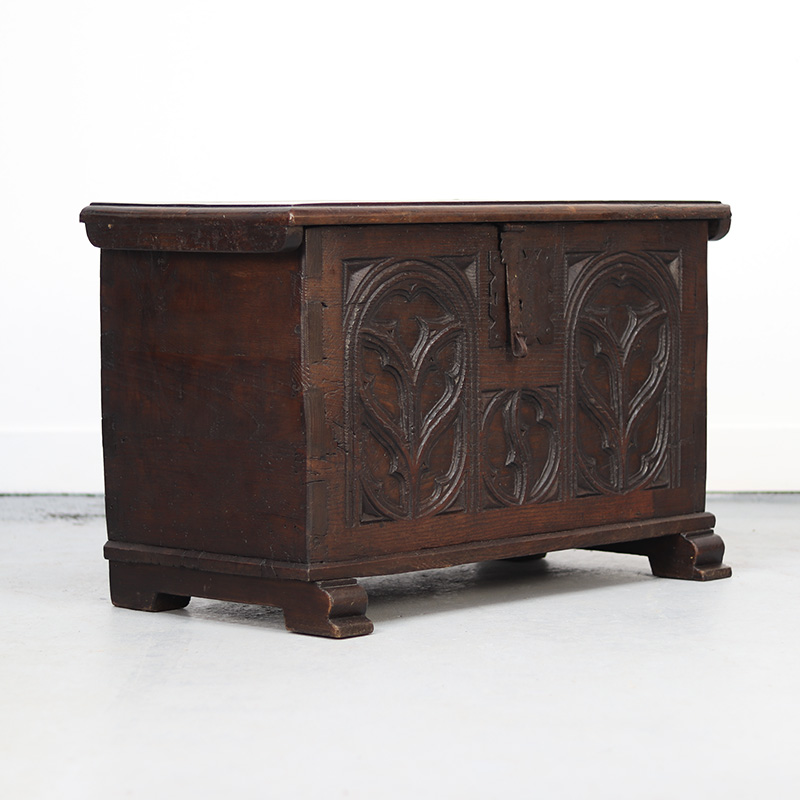 Deze 18e eeuwse Spaanse kist is gemaakt van dik eikenhout met gotische versieringen op het voorste paneel. Het zwaar gepatineerde hout toont volop karakter. De kist is vakkundig gerestaureerd waarbij delen, waaronder de deksel zijn vervangen. Een prachtig historisch stuk met een rijke uitstraling.