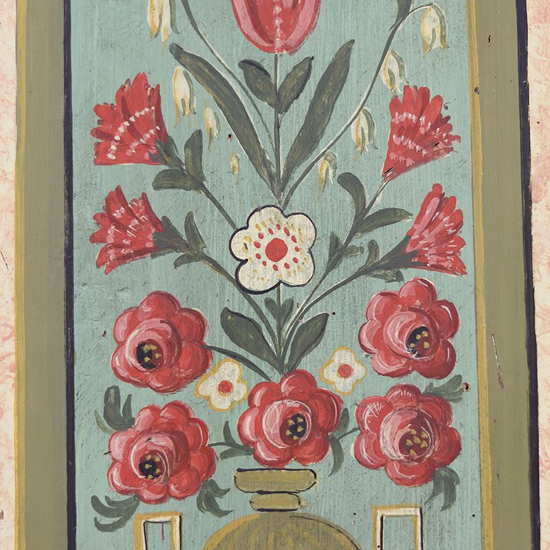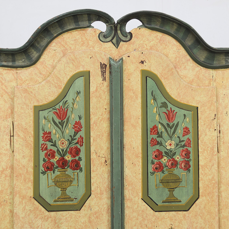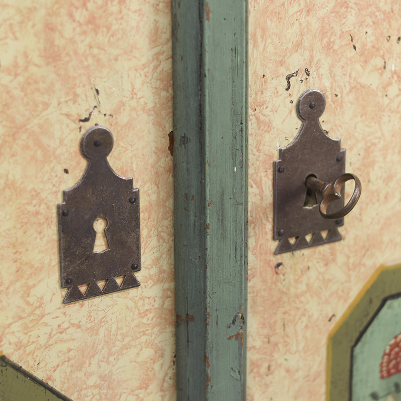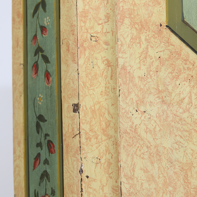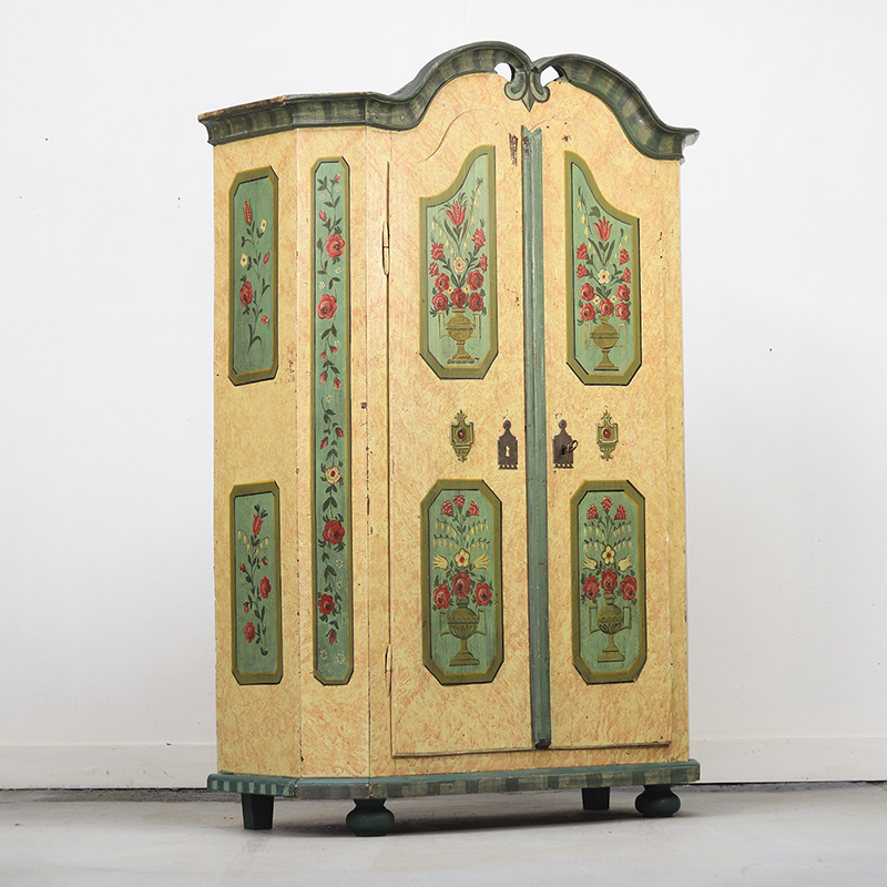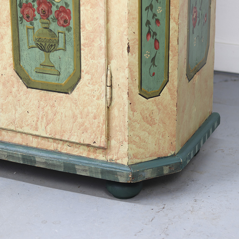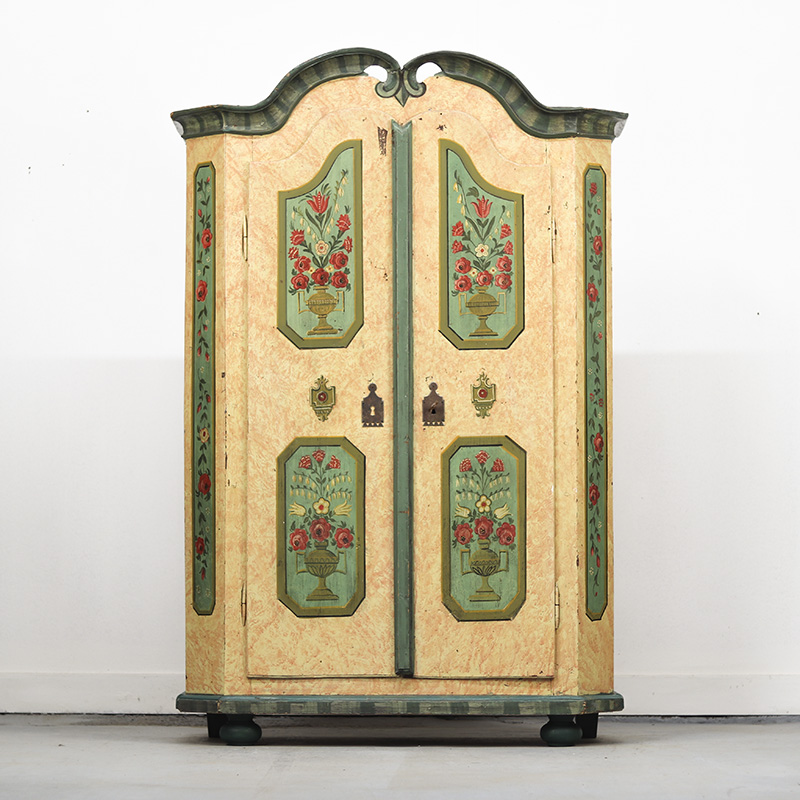 Prachtige antieke bruidskast van grenen. Deze kast is afkomstig uit Zuid-Duitsland en dateert omstreeks 1850. Dit meubel is ooit gerestaureerd en opnieuw beschilderd geweest. Zij het niet op originele wijze en met ambacht uit de tijd. De kleurrijke bloemenpanelen en de zachtroze gemarmerde beschildering over het geheel geven het meubel een zeer rustieke en romantische uitstraling. De kast is middelgroot qua formaat en is aan de binnenzijde voorzien van legplanken. De deuren zijn af te sluiten met een slot/sleutel. Lichte gebruikers sporen passend bij de leeftijd zijn waar te nemen, al valt er niets uitzonderlijks op te merken. Vroeger was het gewoonte om bruidsmeubelen als deze bij een trouwerij cadeau te geven aan het echtpaar. Deze meubelen werden naderhand op de boerderij in een pronkkamer geplaatst die enkel zelden gebruikt werd bij hoog bezoek of speciale gelegenheden. Een prachtig en decoratief stuk geschiedenis dus. Ondanks de latere beschildering op dit meubel doet de kast qua uitstraling niet onder aan andere exemplaren. Maar is daardoor voor de klant aantrekkelijk geprijsd.