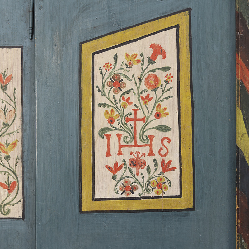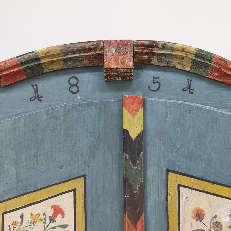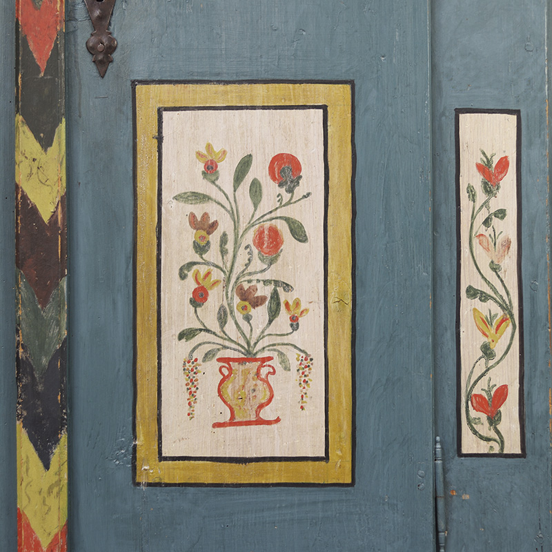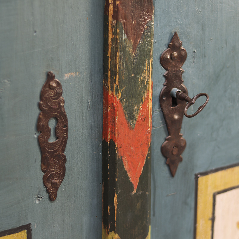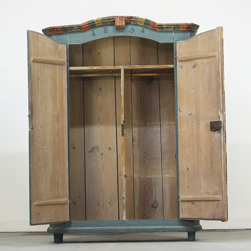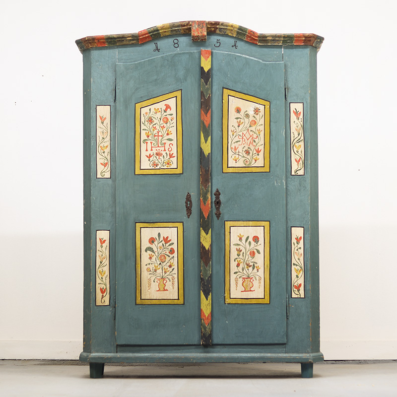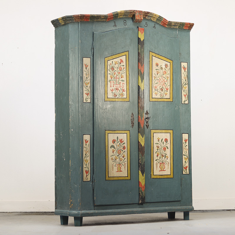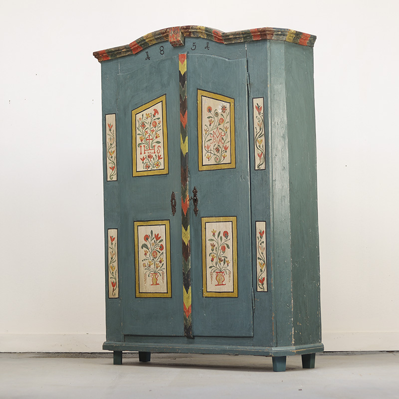 Buitengewone antieke bruidskast van grenen welke uit 1851 dateert. Deze kast is eenvoudig vormgegeven maar is prachtig beschilderd in een frisse blauwe kleur met florale en religieuze versieringen in de panelen. Op de kuif is tevens de trouwdatum van de vorige eigenaar geschilderd. Dit exemplaar verkeert voor zijn leeftijd nog in een nette staat al zijn er vanzelfsprekend enkele lichte gebruikers sporen waar te nemen. Zoals sporadisch enkele oude houtworm sporen welke uiteraard zijn nagelopen en behandeld en tevens is de verf op sommige plaatsen wat gesleten. Al met al een zeer karakteristiek exemplaar. Het interieur van de kast bestaat uit een legplank en twee roedes. De kast heeft nog het originele werkende slot met sleutel. Vroeger was het gewoonte om bruidsmeubelen als deze bij een trouwerij cadeau te geven aan het echtpaar. Deze meubelen werden naderhand op de boerderij in een pronkkamer geplaatst die enkel zelden gebruikt werd bij hoog bezoek of speciale gelegenheden. Een prachtig en decoratief stuk geschiedenis dus. Dit exemplaar is uit Zuid Duitsland afkomstig.