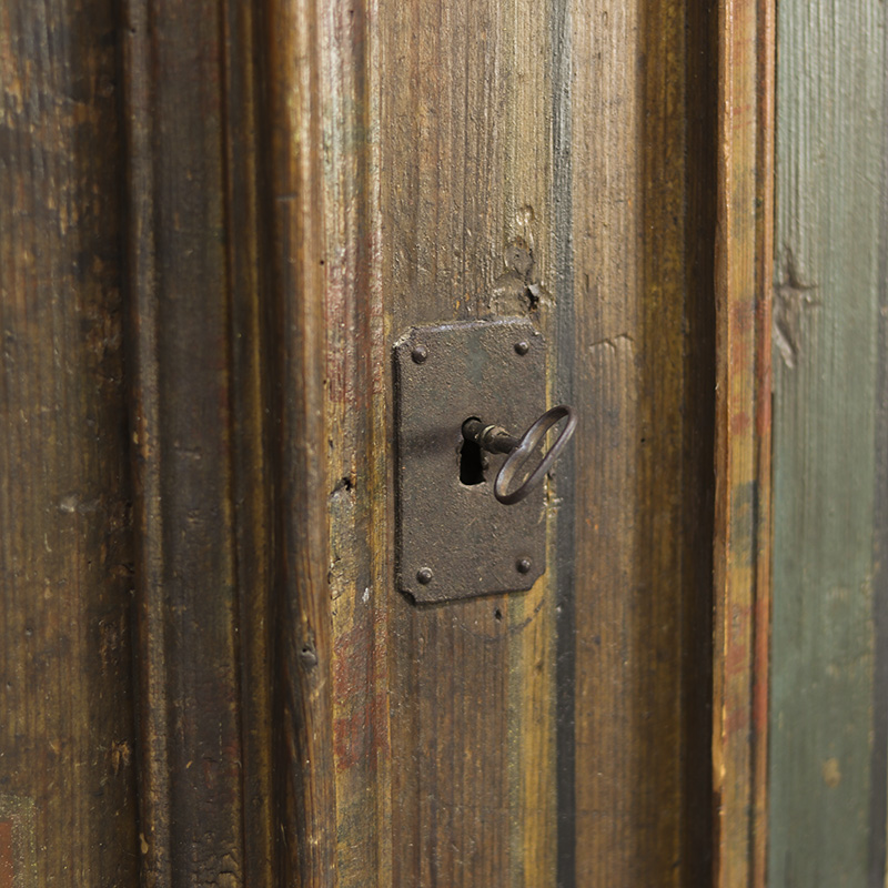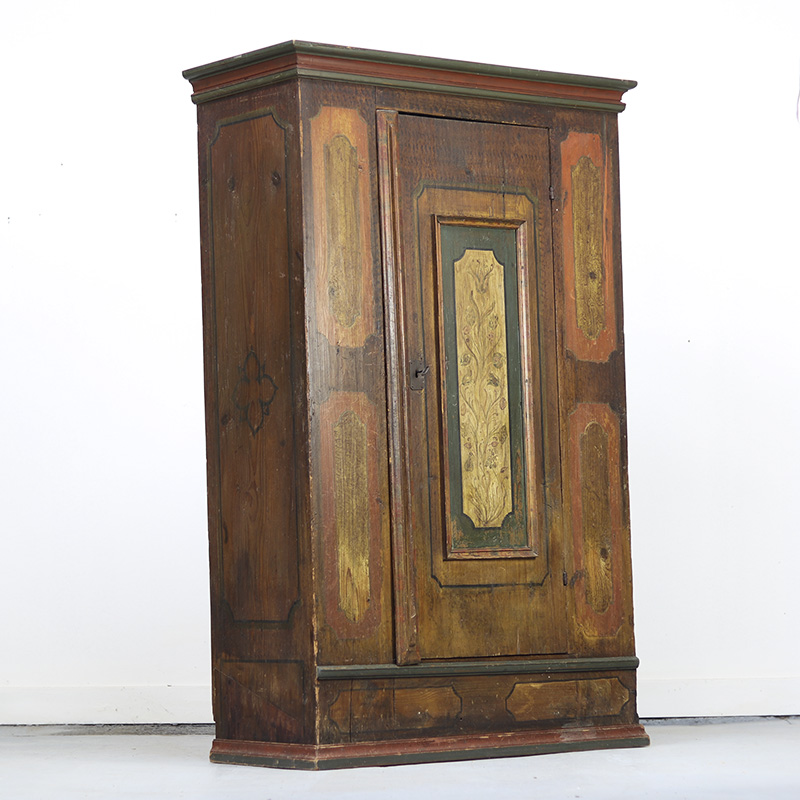 Buitengewone antieke bruidskast van grenen welke omstreeks 1825 dateert. Deze kast is eenvoudig vormgegeven maar is prachtig beschilderd in rustieke kleuren en met een levensboom in het deurpaneel. Dit exemplaar verkeert voor zijn leeftijd nog in een nette staat al zijn er vanzelfsprekend enkele lichte gebruikers sporen waar te nemen. Zoals sporadisch enkele oude houtworm sporen welke uiteraard zijn nagelopen en behandeld en tevens vertoont de kast enkele oude reparaties. Al met al een zeer karakteristiek exemplaar. Het interieur van de kast bestaat uit legplanken en een moderne roede. De kast heeft nog het originele werkende slot met sleutel. Vroeger was het gewoonte om bruidsmeubelen als deze bij een trouwerij cadeau te geven aan het echtpaar. Deze meubelen werden naderhand op de boerderij in een pronkkamer geplaatst die enkel zelden gebruikt werd bij hoog bezoek of speciale gelegenheden. Een prachtig en decoratief stuk geschiedenis dus. Dit exemplaar is uit Zuid Duitsland afkomstig.