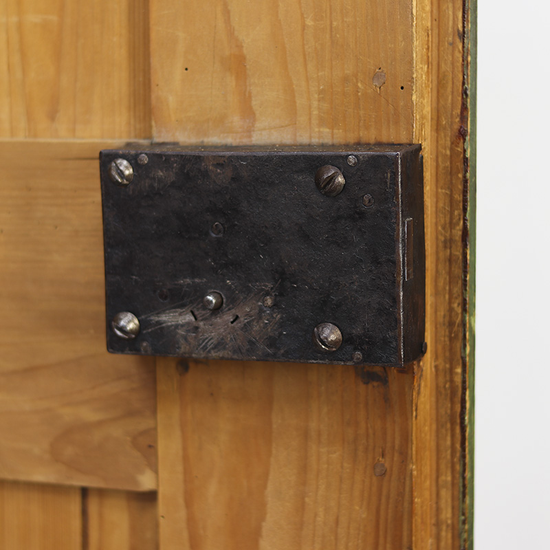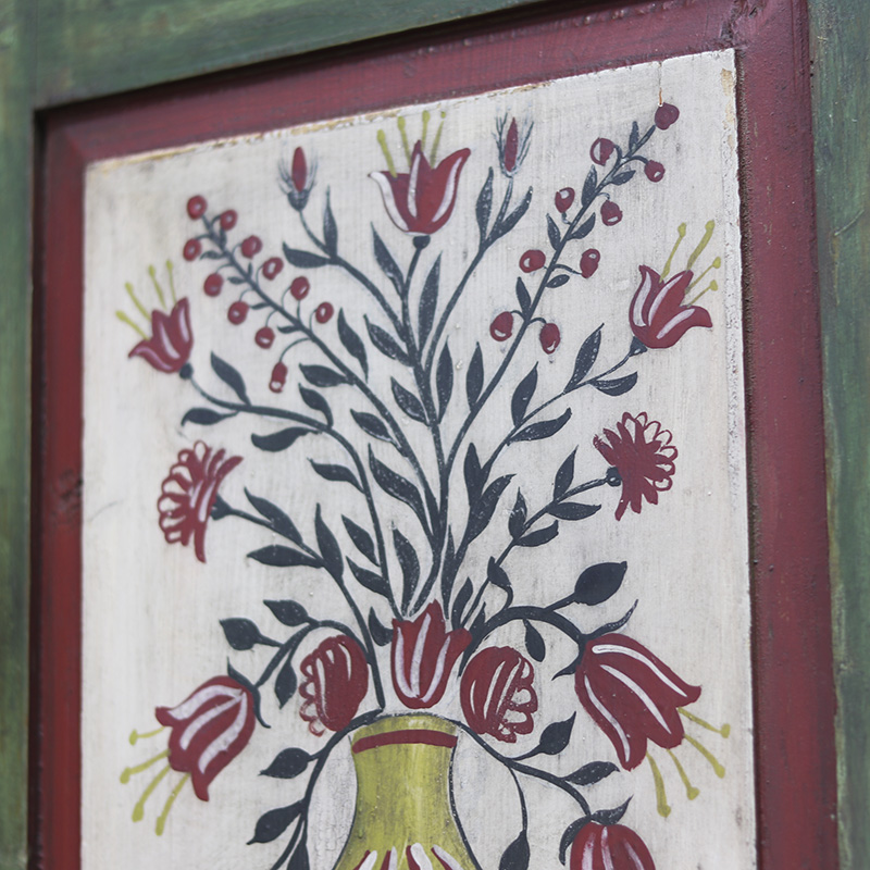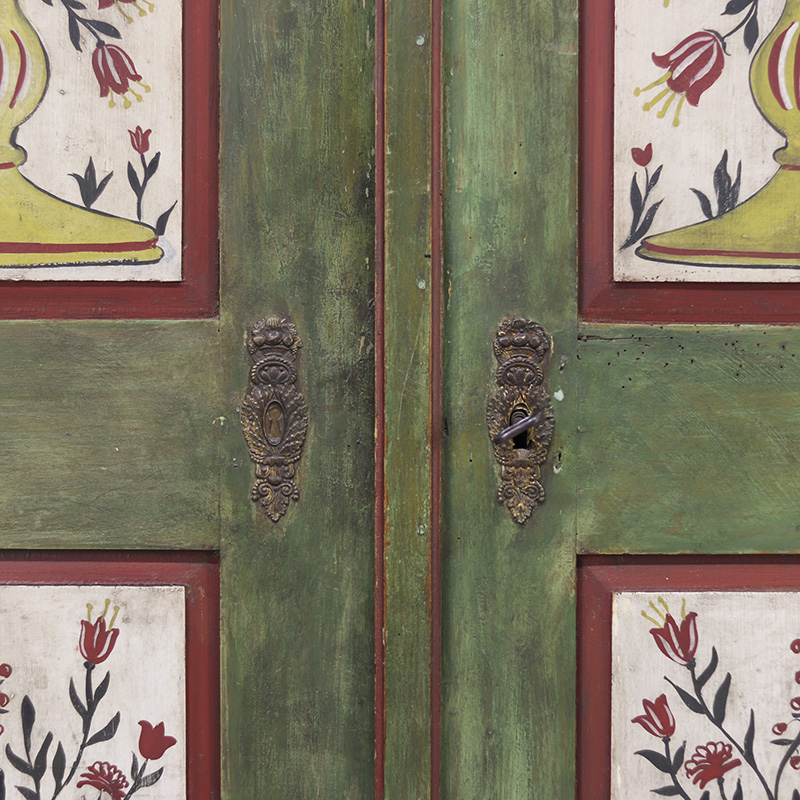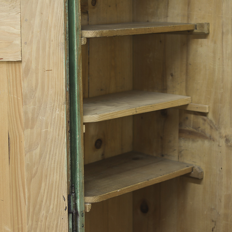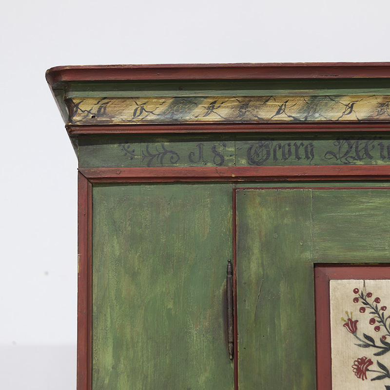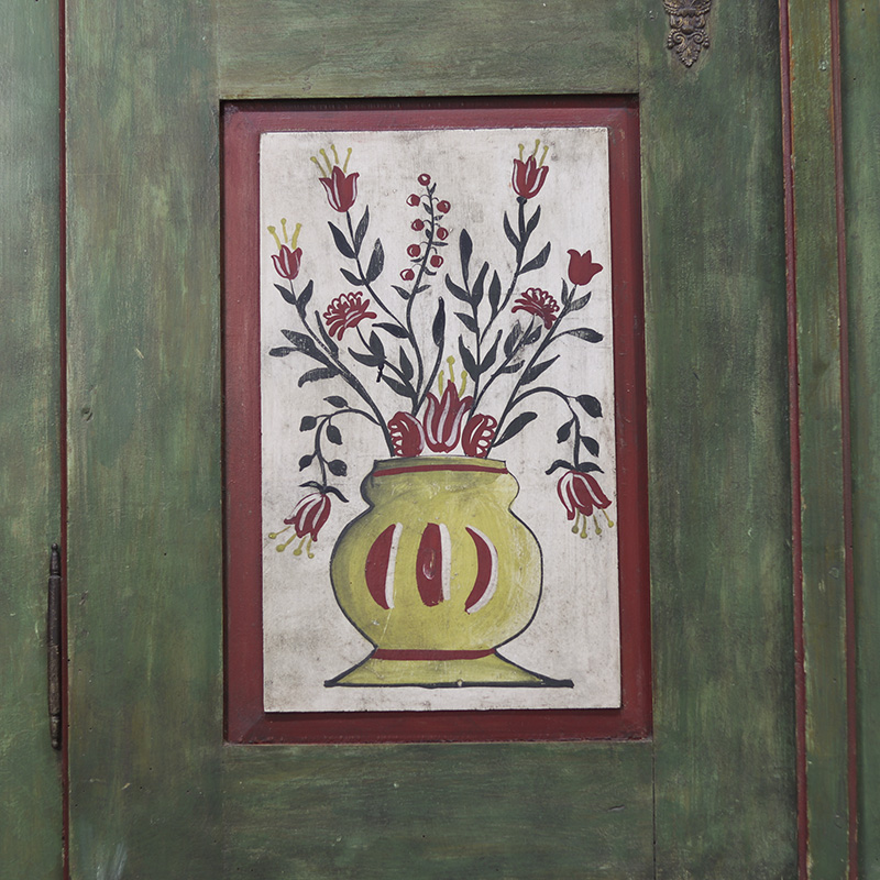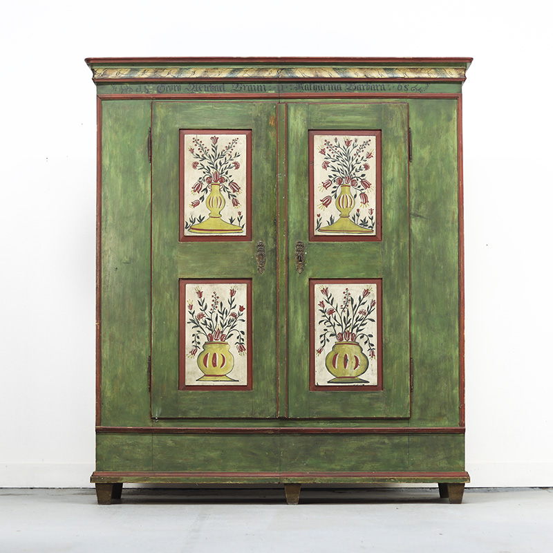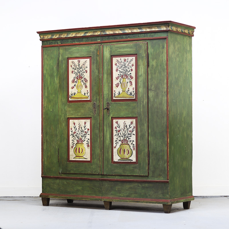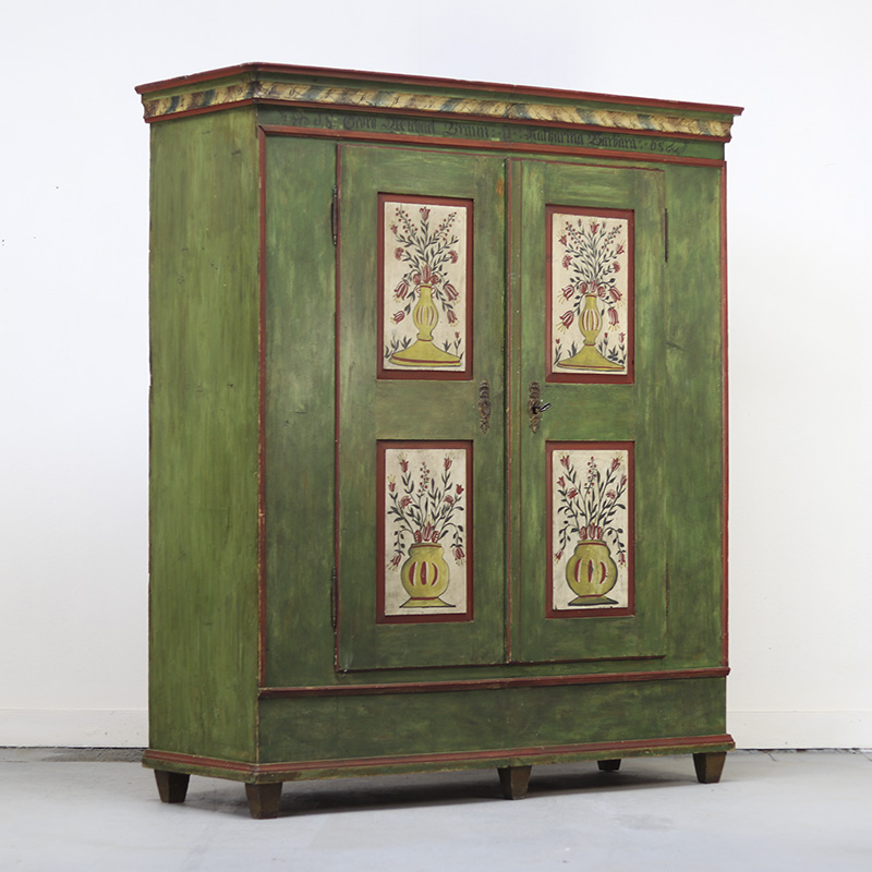 Buitengewone antieke bruidskast van grenen welke uit 1868 dateert. Deze kast is eenvoudig vormgegeven maar is prachtig beschilderd in een groene kleur met florale versieringen in de panelen. Op de kuif is tevens de trouwdatum en namen van de vorige eigenaar geschilderd. Dit exemplaar verkeert voor zijn leeftijd nog in een nette staat al zijn er vanzelfsprekend enkele lichte gebruikers sporen waar te nemen. Zoals sporadisch enkele oude houtworm sporen welke uiteraard zijn nagelopen en behandeld en tevens is de verf op sommige plaatsen wat gesleten. Al met al een zeer karakteristiek exemplaar. Het interieur van de kast bestaat uit een stel kleine legplanken, kapstokhaken en een moderne roede. De kast heeft nog het originele werkende slot met sleutel. Vroeger was het gewoonte om bruidsmeubelen als deze bij een trouwerij cadeau te geven aan het echtpaar. Deze meubelen werden naderhand op de boerderij in een pronkkamer geplaatst die enkel zelden gebruikt werd bij hoog bezoek of speciale gelegenheden. Een prachtig en decoratief stuk geschiedenis dus. Dit exemplaar is uit Zuid Duitsland afkomstig. De kast is in twee delen te vervoeren.