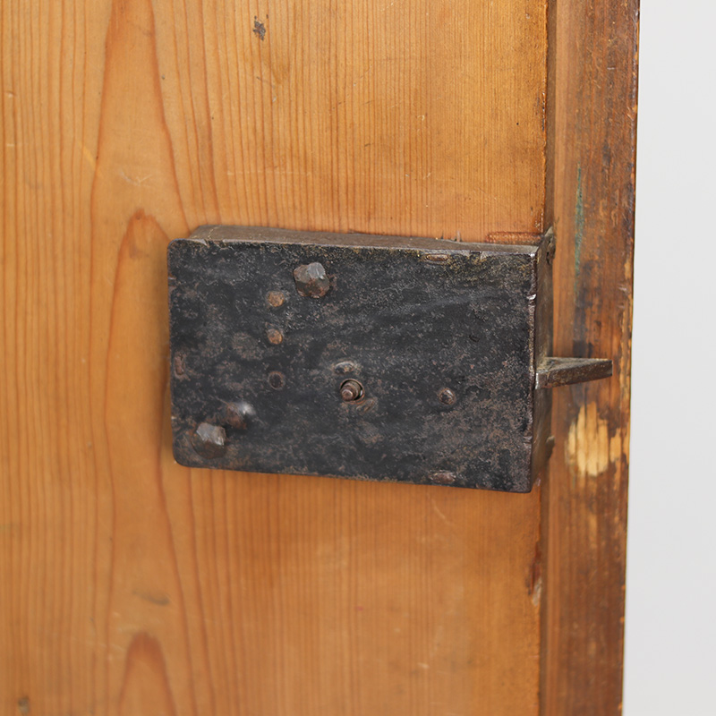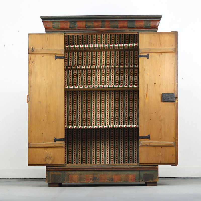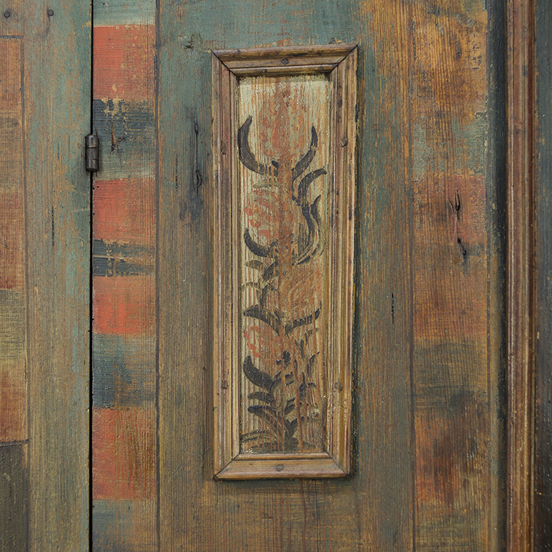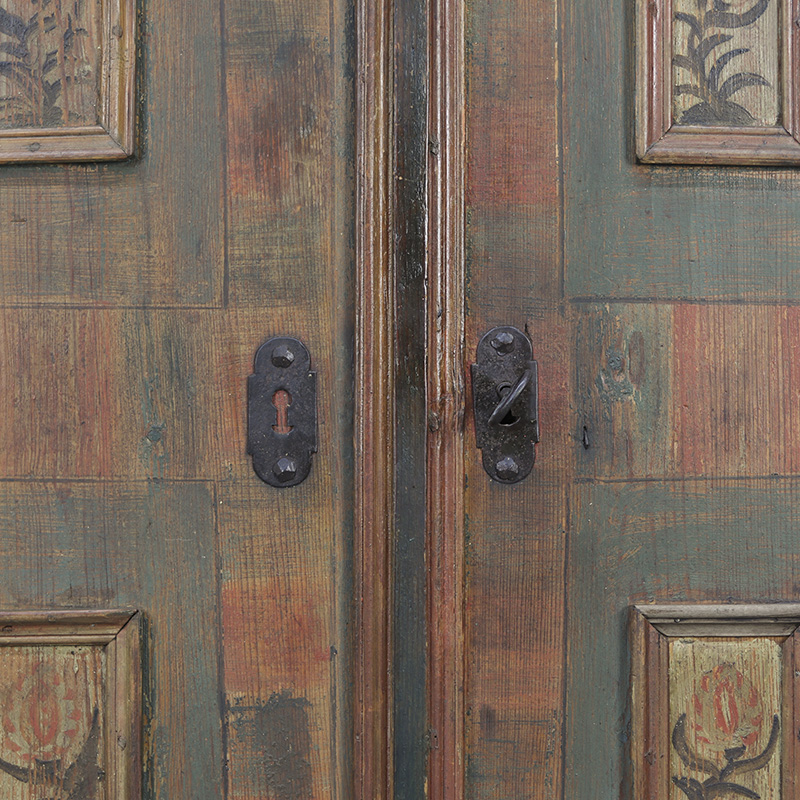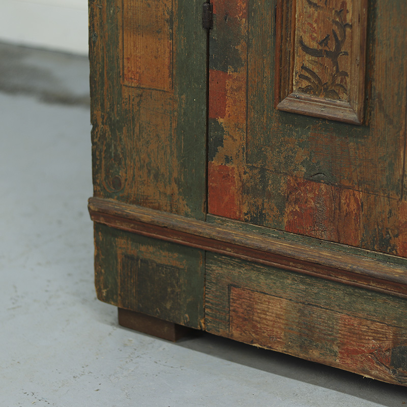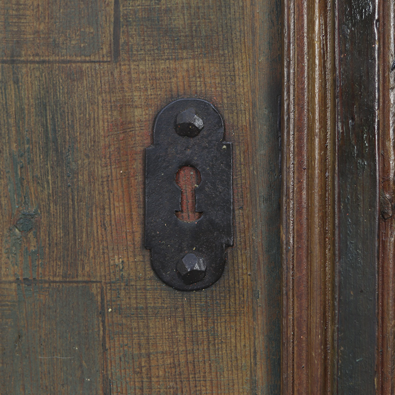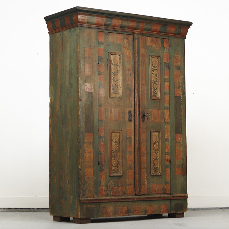 Buitengewone antieke bruidskast van grenen welke uit 1790 dateert. Deze kast is eenvoudig vormgegeven maar is prachtig beschilderd in hoofdzakelijk groene en rode kleuren met florale versieringen in de panelen. Dit exemplaar verkeert voor zijn leeftijd nog in een nette staat al zijn er vanzelfsprekend enkele lichte gebruikers sporen waar te nemen. Zoals sporadisch enkele oude houtworm sporen welke uiteraard zijn nagelopen en behandeld en tevens is de verf aardig gesleten. Al met al een zeer karakteristiek exemplaar. Het interieur van de kast bestaat uit legplanken. De kast heeft nog het originele werkende slot met sleutel. Vroeger was het gewoonte om bruidsmeubelen als deze bij een trouwerij cadeau te geven aan het echtpaar. Deze meubelen werden naderhand op de boerderij in een pronkkamer geplaatst die enkel zelden gebruikt werd bij hoog bezoek of speciale gelegenheden. Een prachtig en decoratief stuk geschiedenis dus. Dit exemplaar is uit Zuid Duitsland afkomstig. Ondanks dat het geschilderde jaartal boven de deuren is vervaagd, konden we deze kast toch dateren daar we uit dezelfde inboedel een kist hebben welke op dezelfde wijze is beschilderd, en wel duidelijk is gedateerd met 1790.