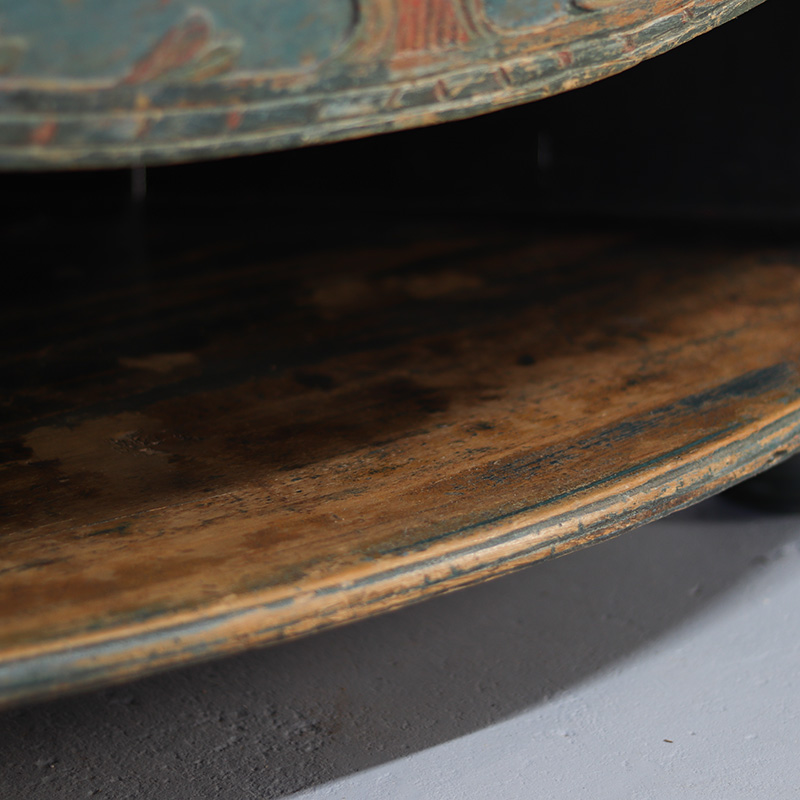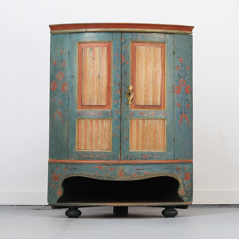 Deze prachtige Zweedse hoekkast uit 1840 is vervaardigd uit grenenhout en nog voorzien van de originele, decoratieve beschildering. De kast is geschilderd in een zachte blauwe kleur met rode accenten en rondom versierd met bloemenmotieven. Het meubel heeft een prachtig patina dat de charme en het karakter extra benadrukt. De kast heeft een praktische indeling met legplanken, waardoor het uitermate geschikt is voor gebruik als drankkast. Onderin bevindt zich nog een open vak, wat extra opbergruimte biedt. Een prachtig stuk volkskunst met een warme landelijke uitstraling.