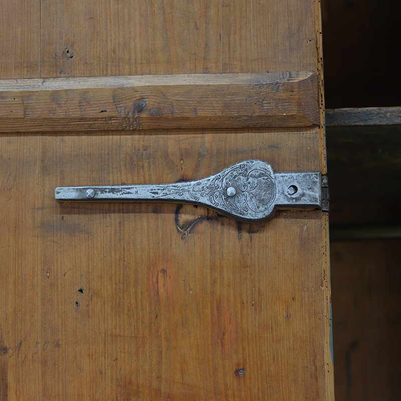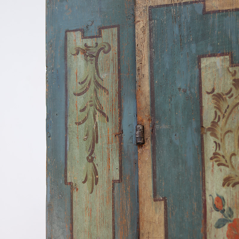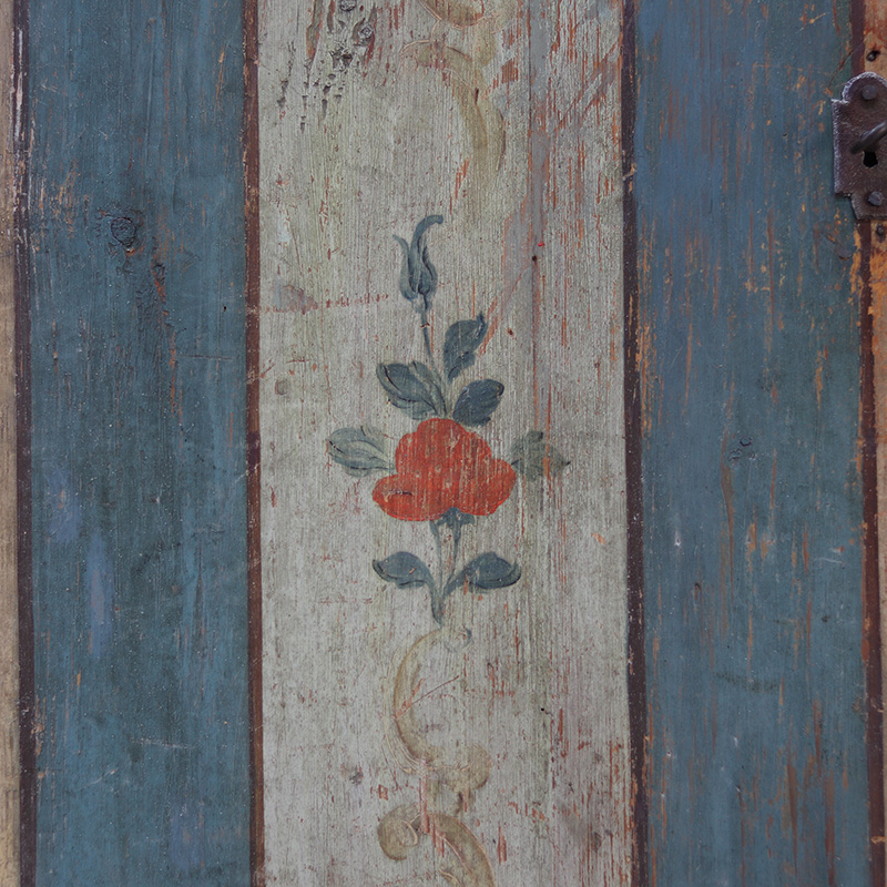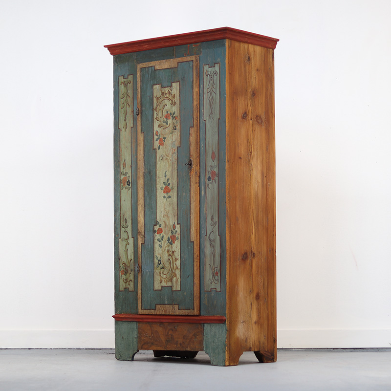 Antieke bruidskast welke omstreeks 1750-1775 dateert uit Franken, Zuid-Duitsland. Het zware geleefde karakter en de originele beschilderingen geven het geheel een waanzinnige uitstraling. Zowel de vormgeving van de kast als de beschildering is eenvoudig en primitief, maar authentiek en een typisch voorbeeld van volkskunst uit de streek. Zo is de kast geschilderd in een zachtblauwe kleur en gedecoreerd met bloemen en C-krullen.