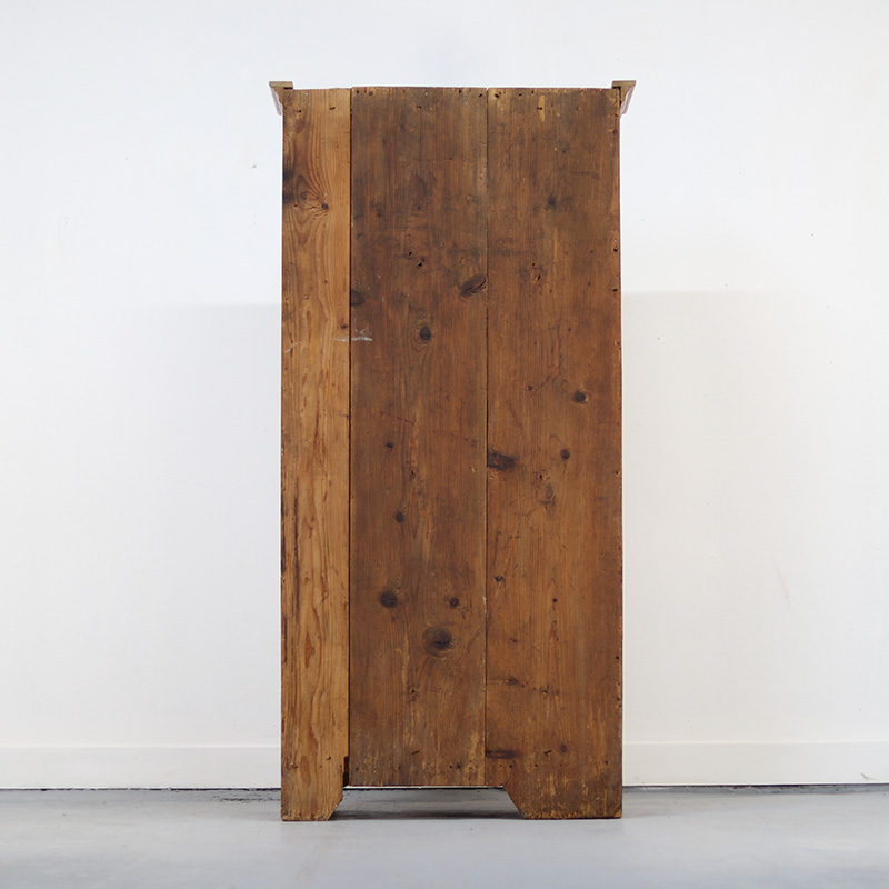 De kast is in haar geheel nagelopen en professioneel gerestaureerd, met oog op originaliteit en karakter. De constructie is solide, de beschildering is gesleten maar geconserveerd en het patina is behouden. De kuif is tevens eens vervangen geweest - al is dit langere tijd geleden gedaan. De indeling bestaat uit een legplank en een roede. De kast is af te sluiten met het originele werkende slot. Oude, sporadisch aanwezige houtworm sporen zijn nagelopen en behandeld.