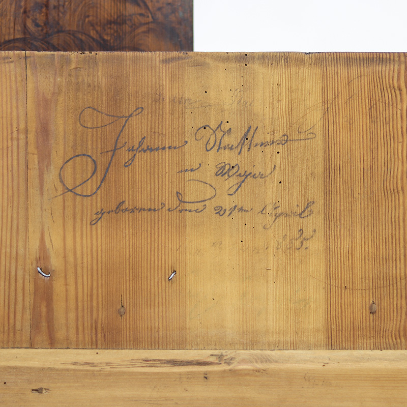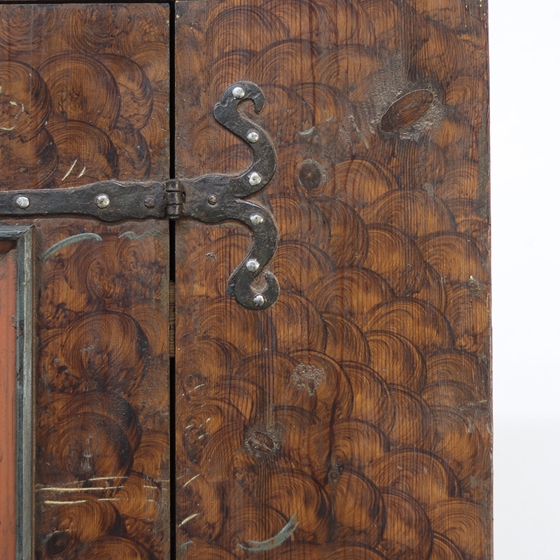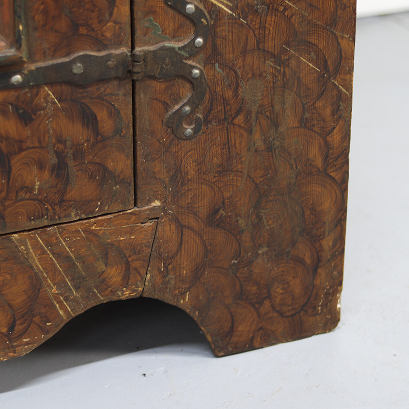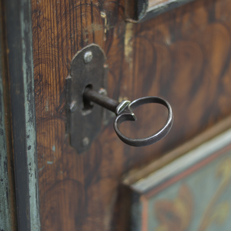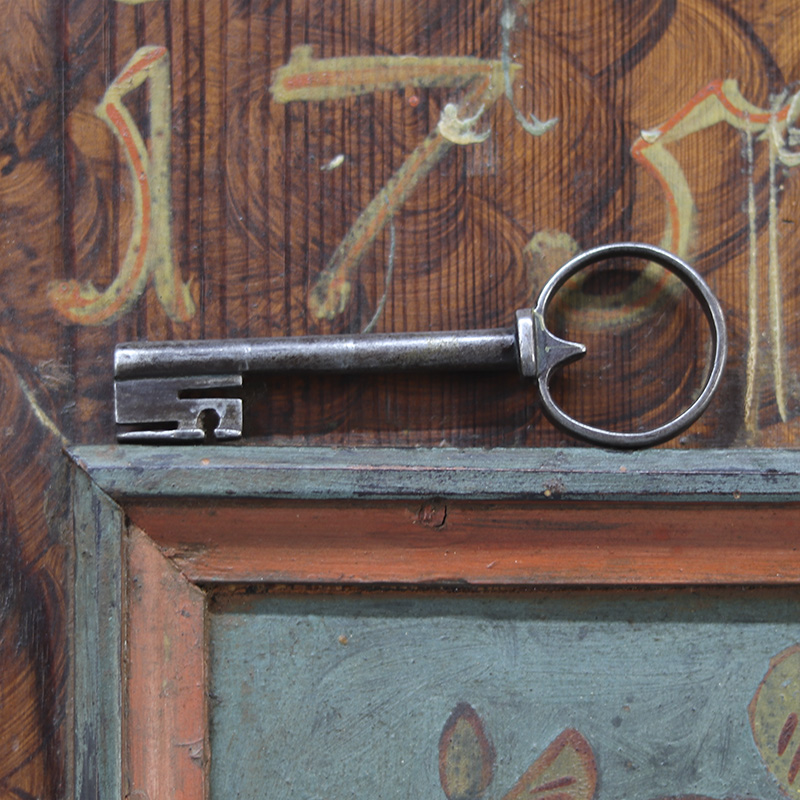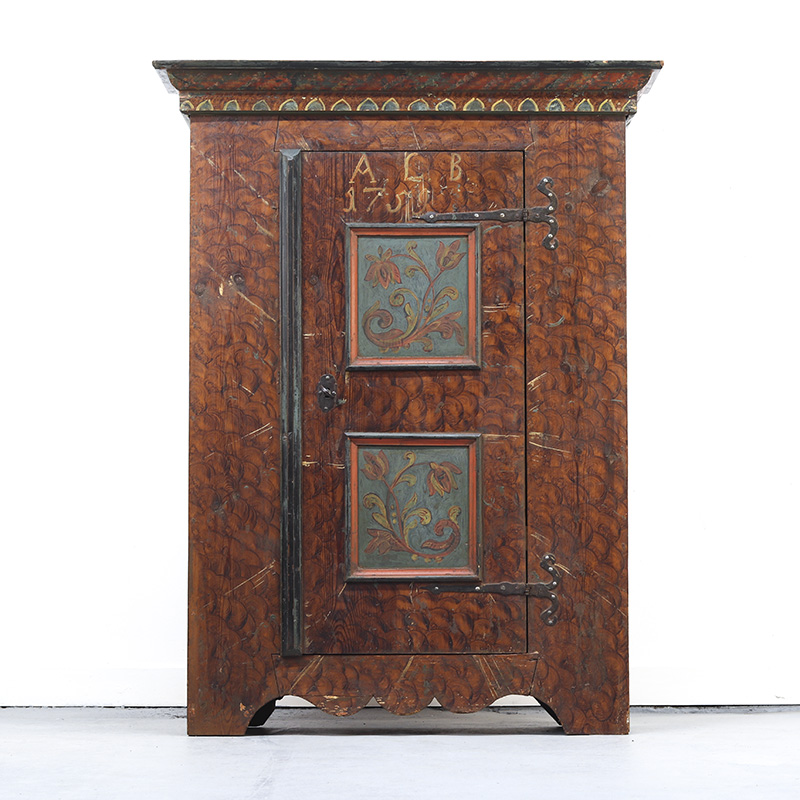 Antieke bruidskast welke uit 1759 dateert, afkomstig uit Franken, Zuid-Duitsland. Het zware geleefde karakter en de originele beschilderingen geven het geheel een waanzinnige uitstraling. Zowel de vormgeving van de kast als de beschildering is eenvoudig en primitief, maar authentiek en een typisch voorbeeld van volkskunst uit de streek. Zo is de kast gedecoreerd met bijzondere motieven en zijn de panelen versierd met bloemen in een frisse blauwe en rode kleur. Bovenop de deur zijn de initialen en trouwdatum van de originele eigenaar zichtbaar.