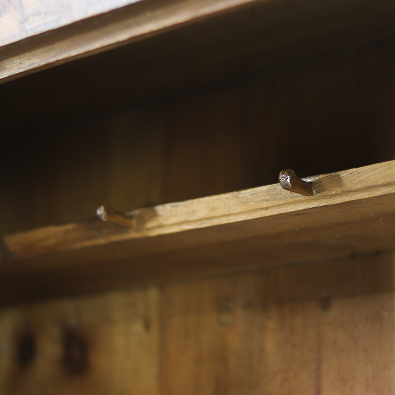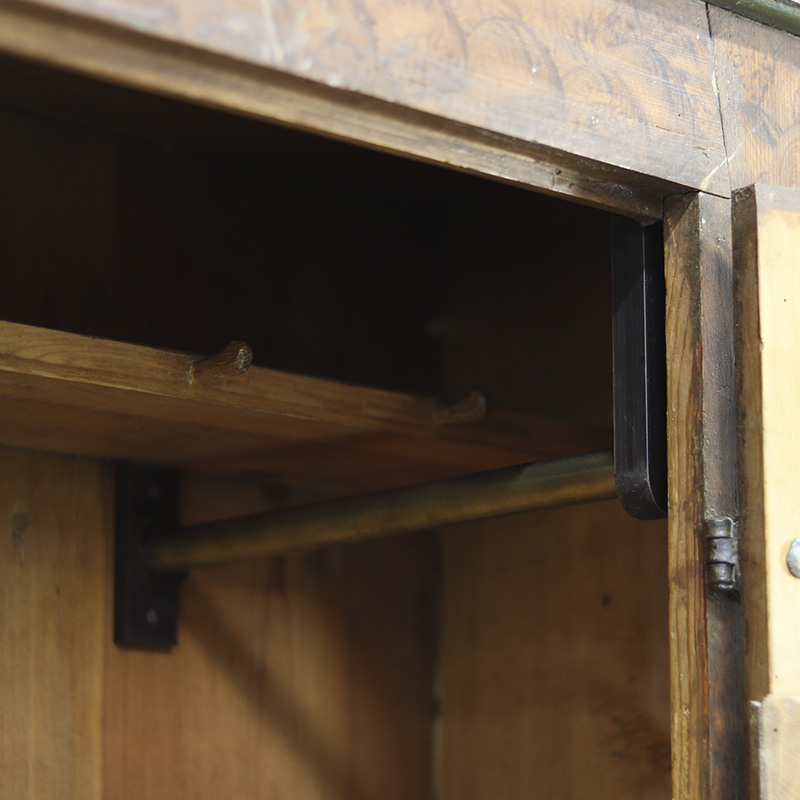 De kast is in haar geheel op professionele wijze nagelopen, met oog op originaliteit en karakter. De constructie is solide, de beschildering is gesleten maar geconserveerd en het patina is behouden. De indeling bestaat uit de originele legplank, waar kapstokhaken aan vast gemonteerd zitten. Later zijn er vier kleine legplanken en een kleine roede toegevoegd. De kast is af te sluiten met het originele werkende slot met imposante sleutel.
