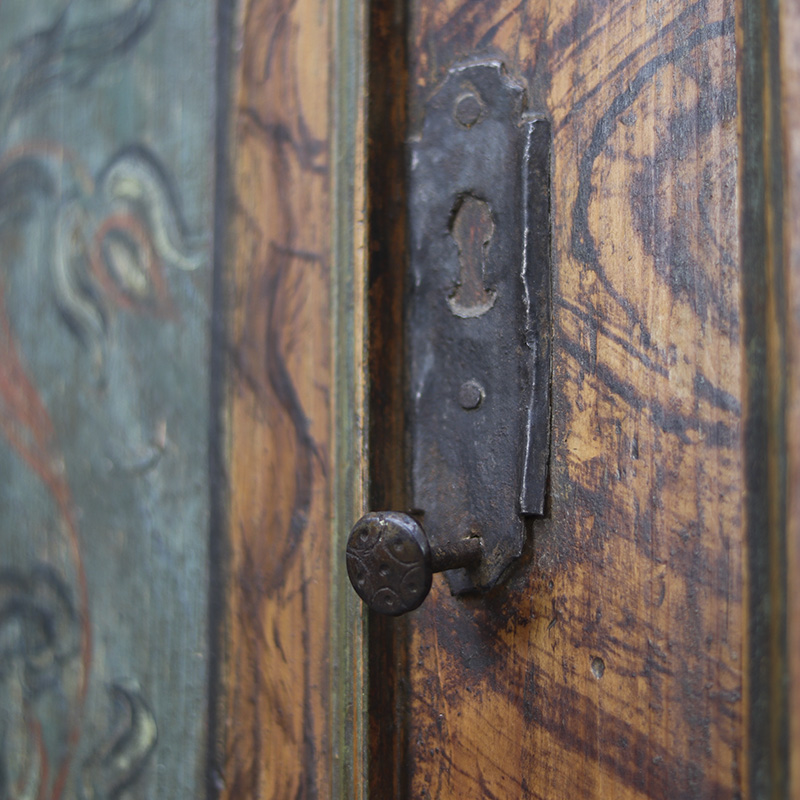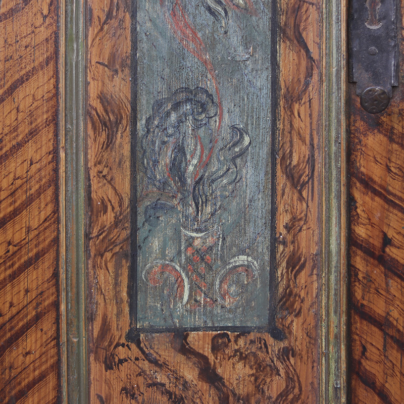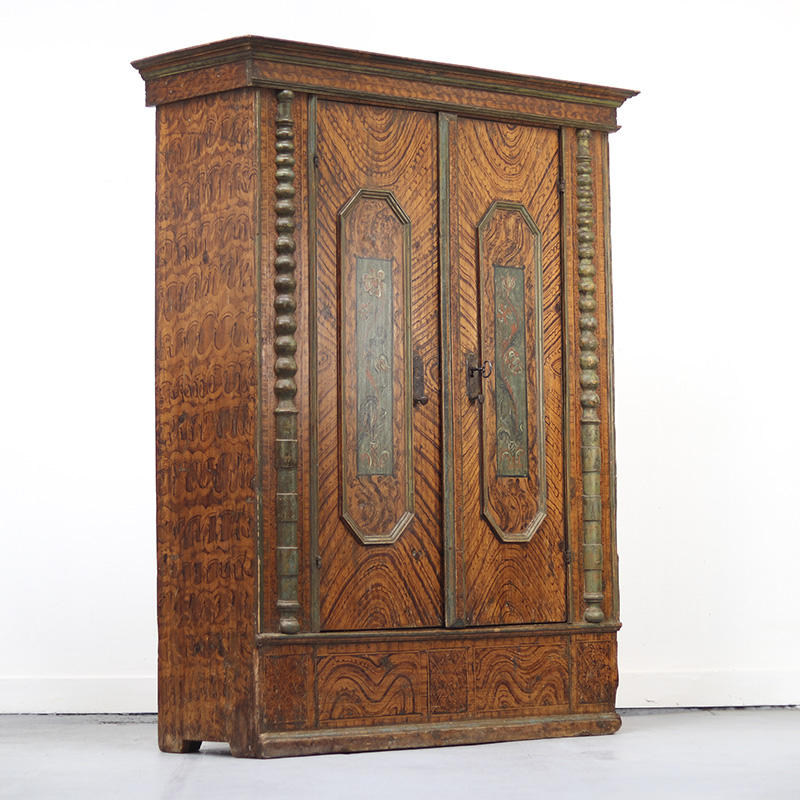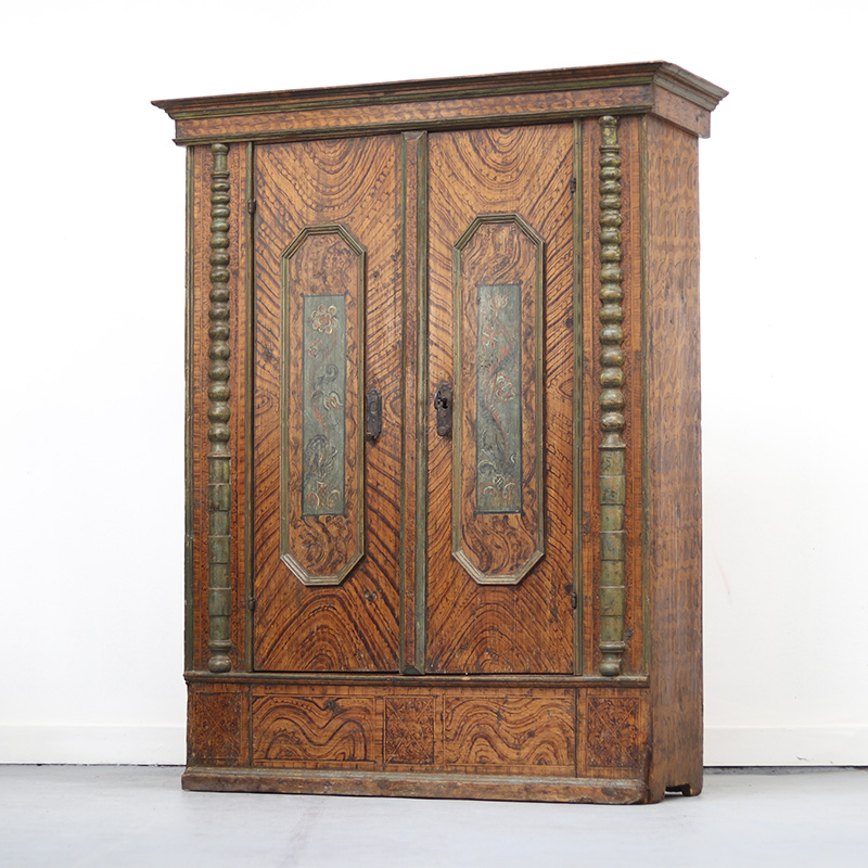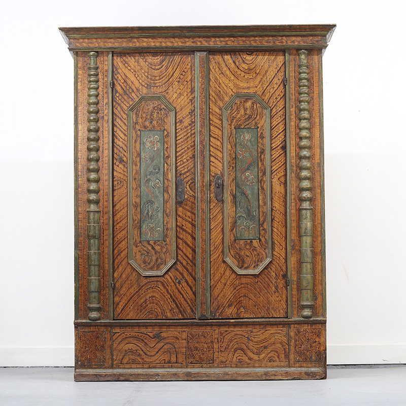 Antieke bruidskast welke omstreeks 1780 dateert, afkomstig uit Franken, Zuid-Duitsland. Het zware geleefde karakter en de originele beschilderingen geven het geheel een waanzinnige uitstraling. Zowel de vormgeving van de kast als de beschildering is eenvoudig en primitief, maar authentiek en een typisch voorbeeld van volkskunst uit de streek. Zo is de kast gedecoreerd met bijzondere motieven en zijn de panelen versierd met levensbomen.