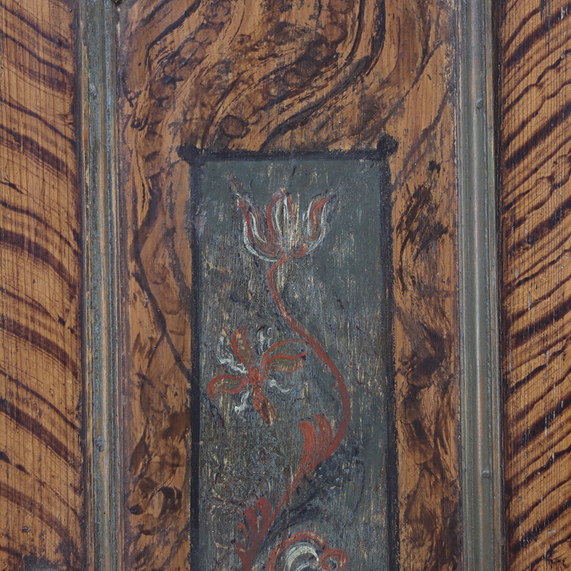 De kast is in haar geheel op professionele wijze nagelopen, met oog op originaliteit en karakter. De constructie is solide, de beschildering is gesleten maar geconserveerd en het patina is behouden. De indeling bestaat uit een originele legplank met kapstokhaken. Later is er nog een roede toegevoegd. De kast is af te sluiten met het originele werkende slot met imposante sleutel.