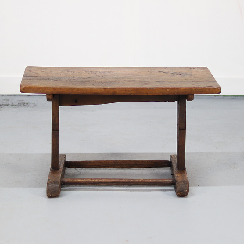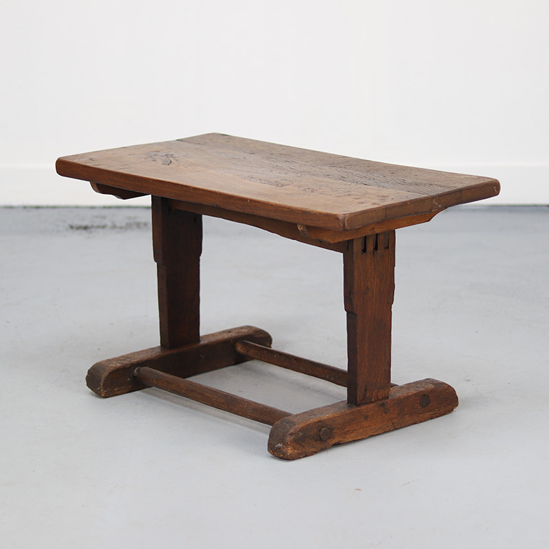 Deze kleine, antieke salontafel is vervaardigd uit massief eikenhout met een onderstel dat is gemaakt van een hergebruikt vlaswerktuig. Het geheel is door de jaren heen op prachtige wijze gesleten en heeft een warm, rijk patina. Het tafelblad is van dik eikenhout vervaardigd en steekt met traditionele pen-gat verbindingen in elkaar.