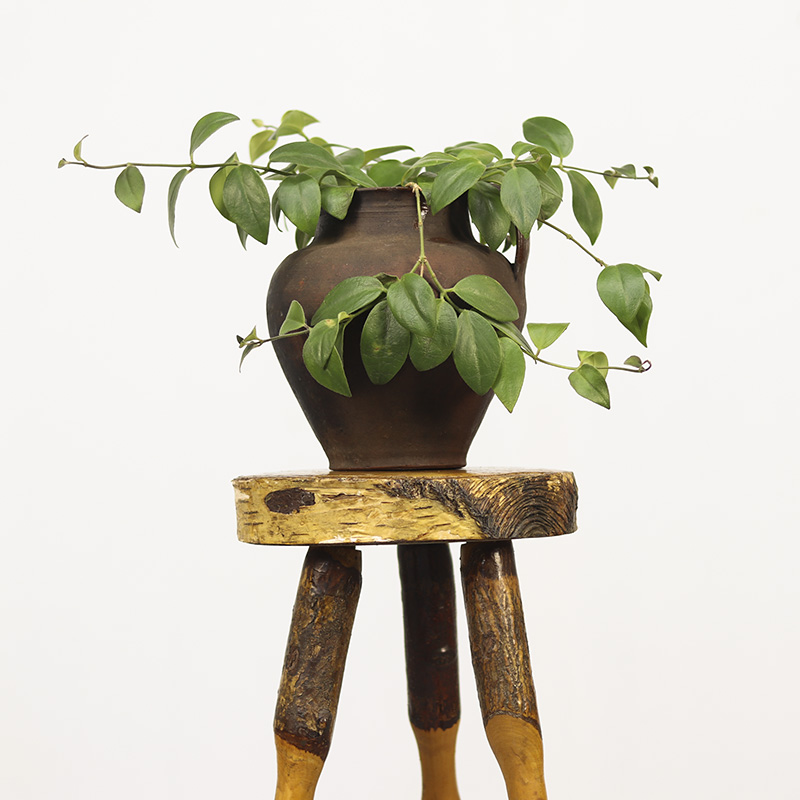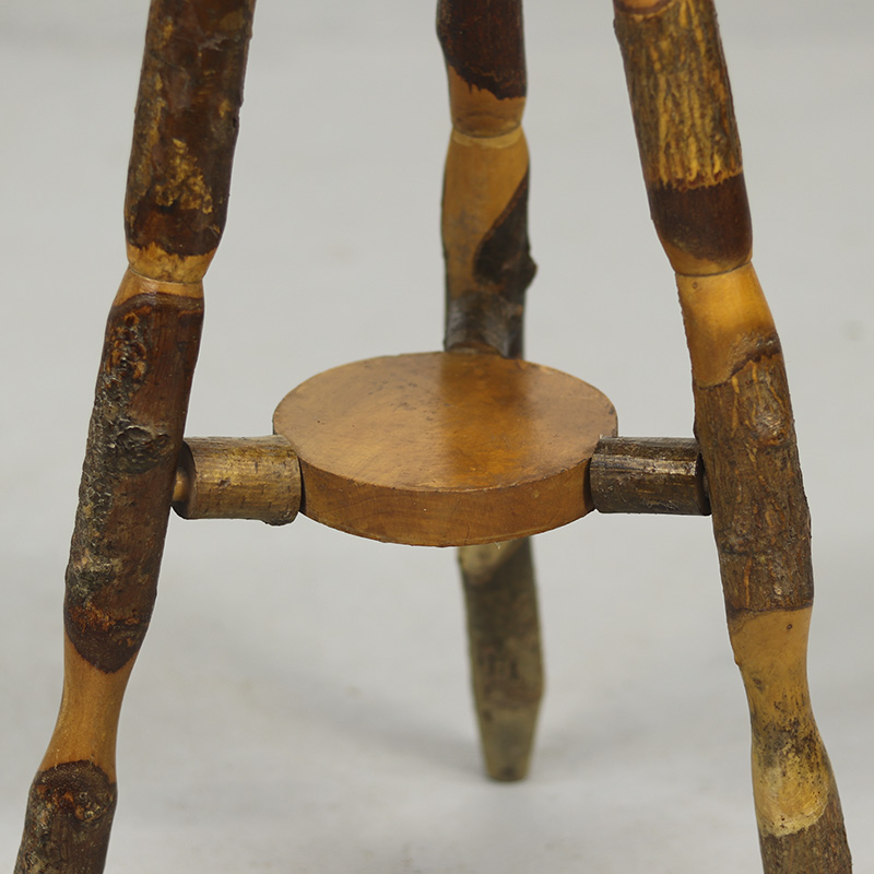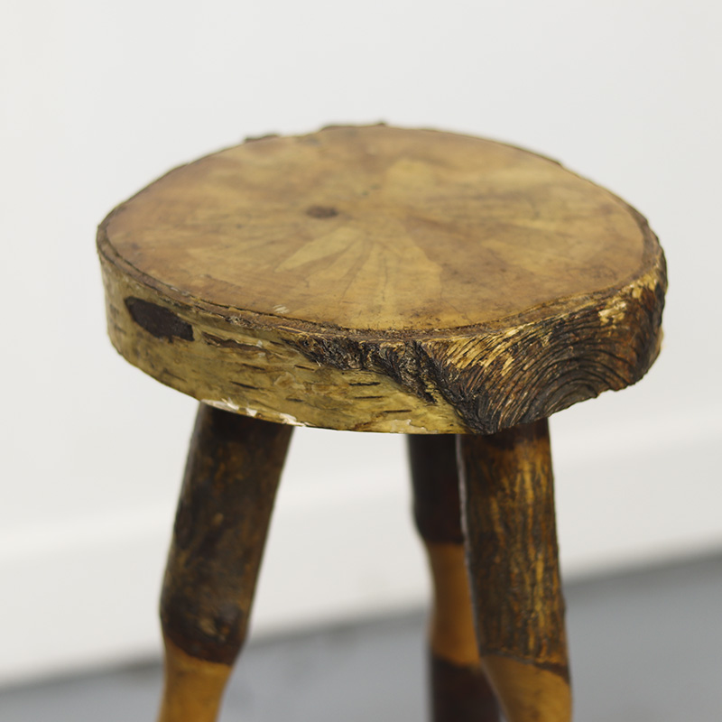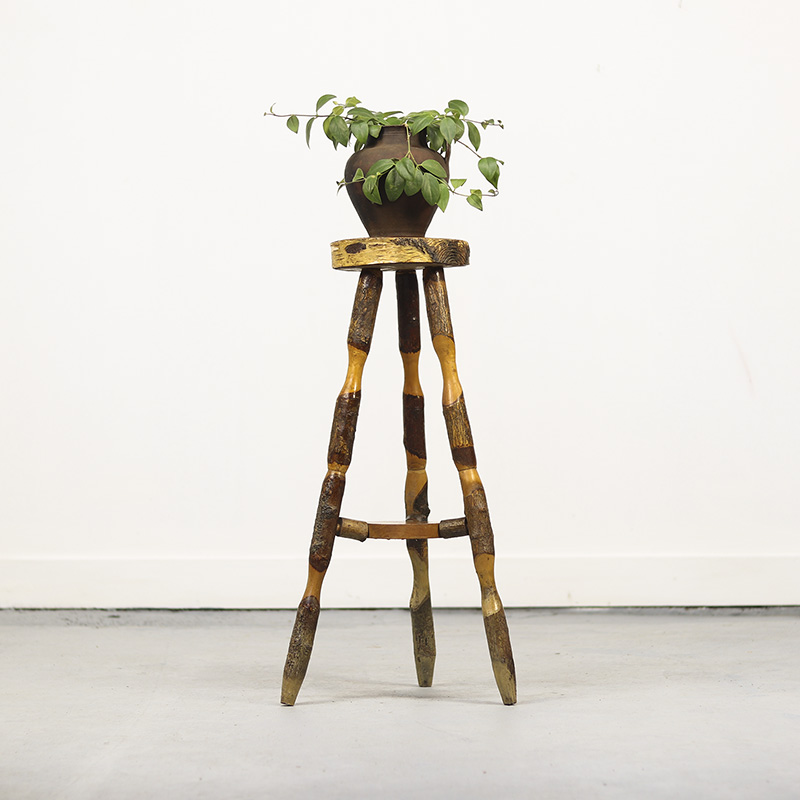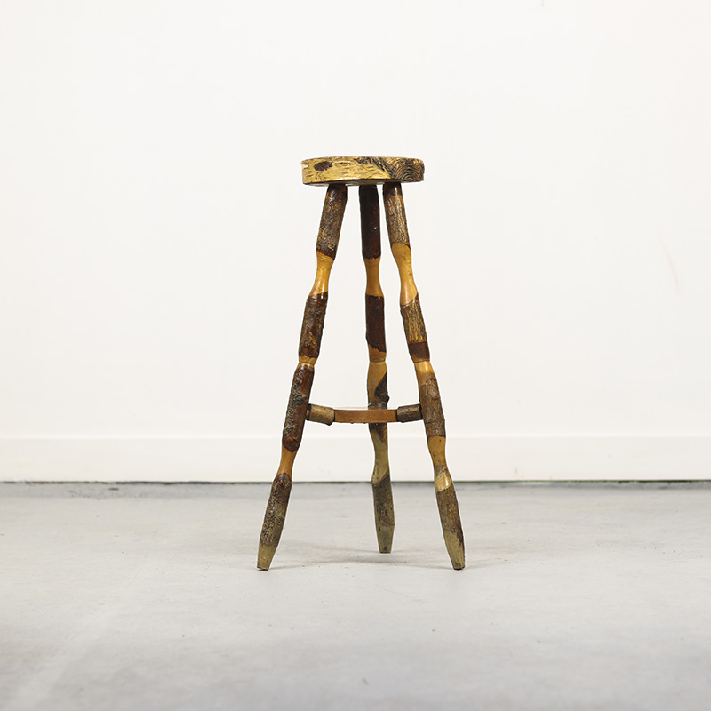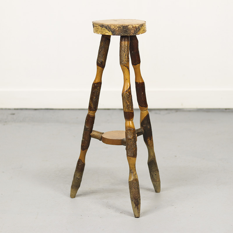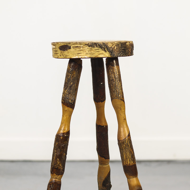 Deze landelijke houten bijzettafel is een prachtig voorbeeld van volkskunst uit de jaren 1970. De tafel is vervaardigd uit ruwe stukken beukenhout, waarbij de natuurlijke bast decoratief is behouden. Herkomst Oost-Europa.