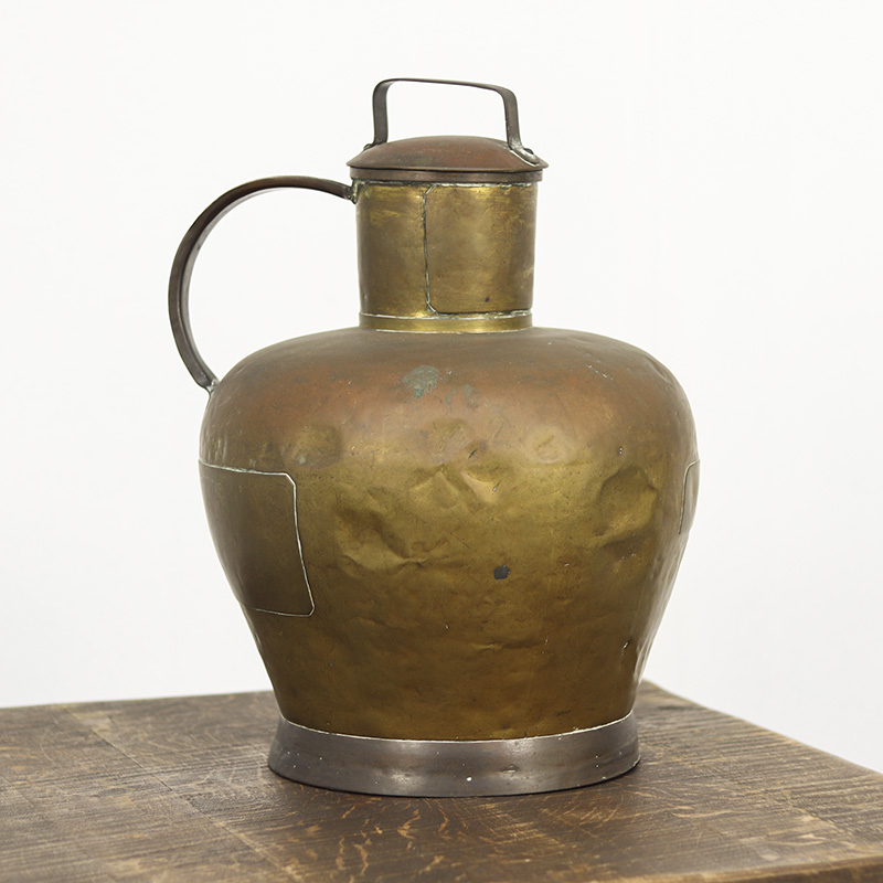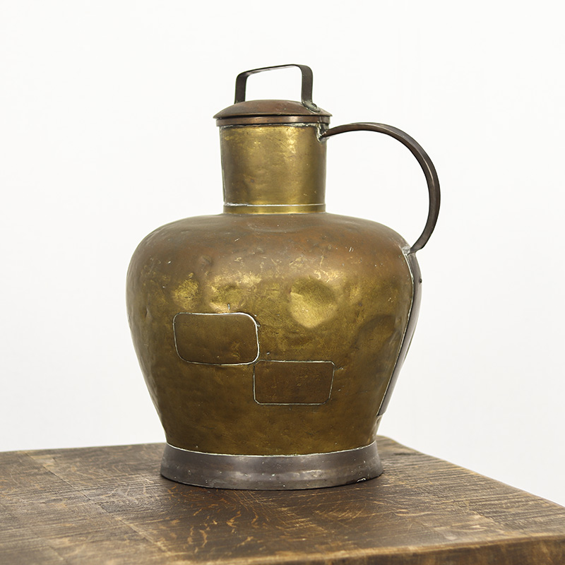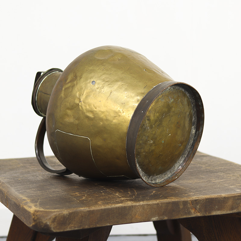 Deze bijzondere antieke Franse melkkan, ook wel canne à lait genoemd, werd in de 19e eeuw gebruikt voor het vervoer van melk van de boerderij naar huis of naar de markt. Het betreft een handgemaakt exemplaar, vervaardigd uit geelkoper, en bovendien uitzonderlijk groot van formaat.