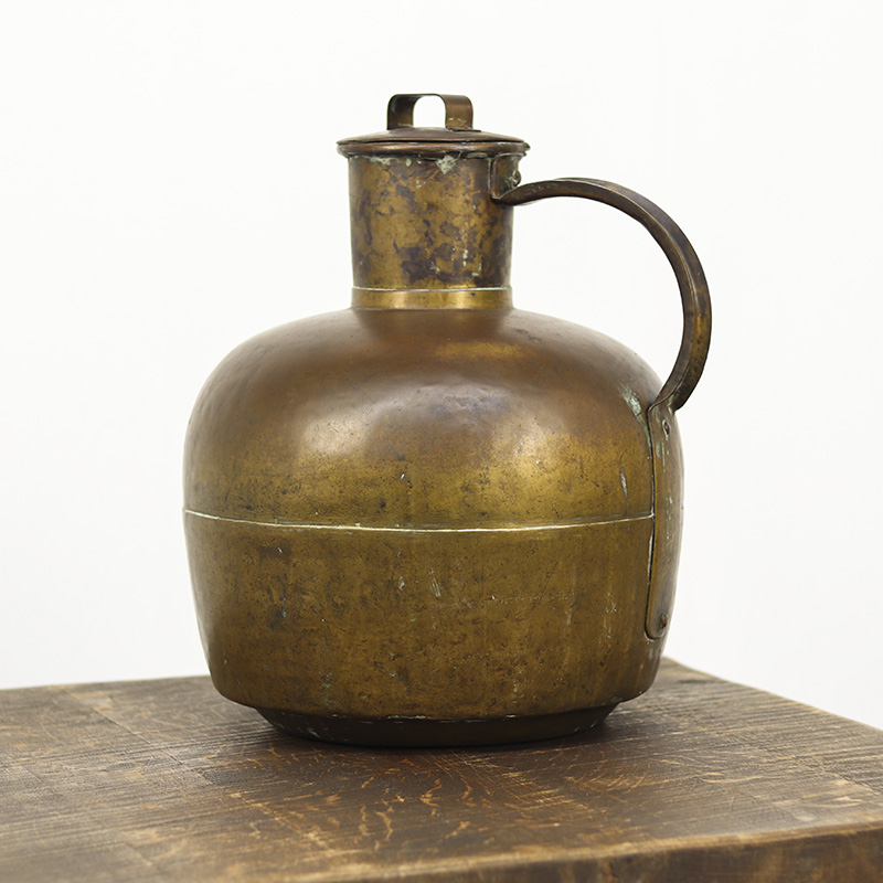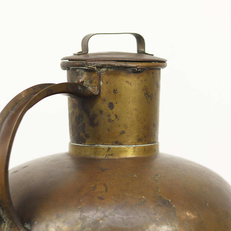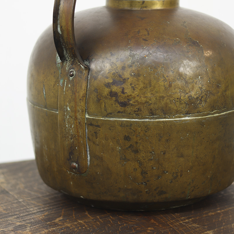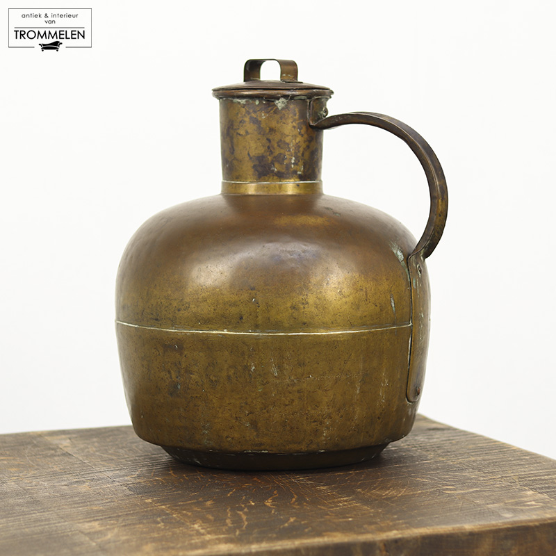 Deze bijzondere antieke Franse melkkan, ook wel canne à lait genoemd, werd in de 19e eeuw gebruikt voor het vervoer van melk van de boerderij naar huis of naar de markt. Het betreft een handgemaakt exemplaar, vervaardigd uit geelkoper, en bovendien uitzonderlijk groot van formaat.