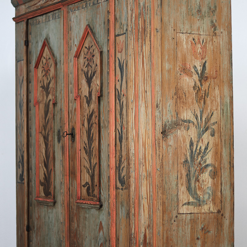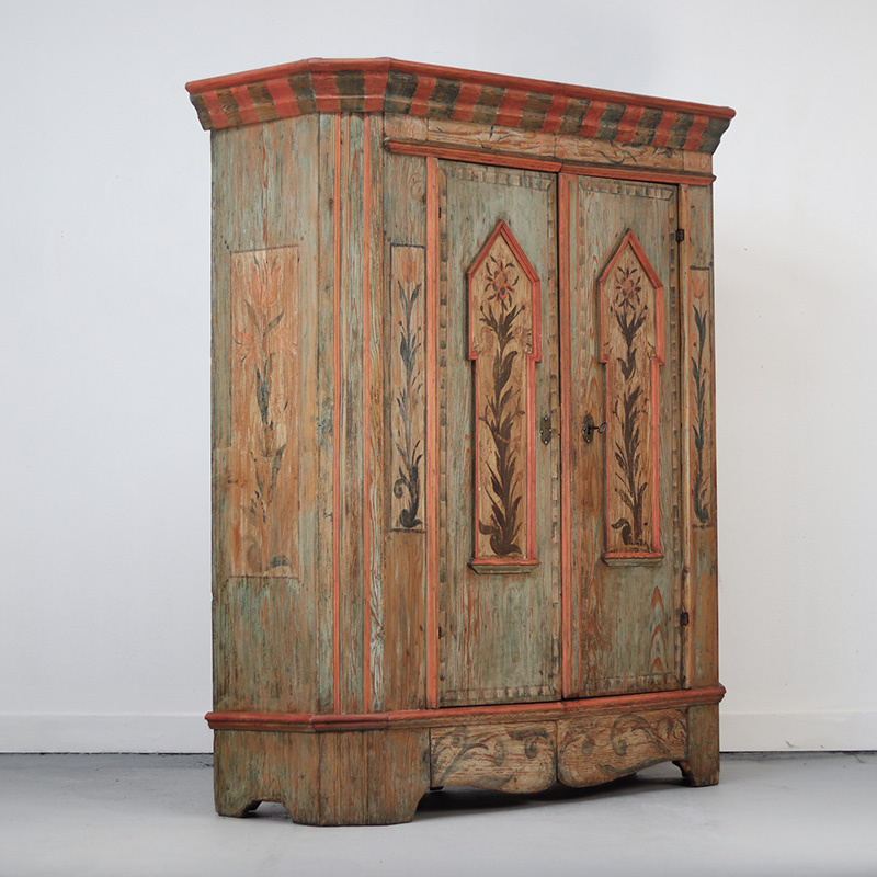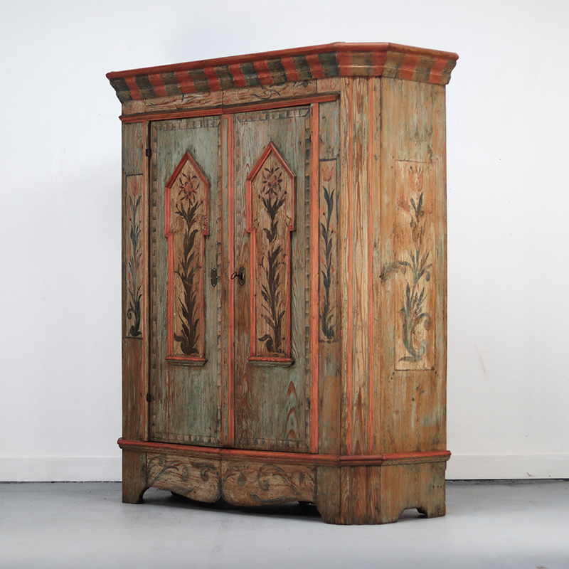 Antieke volkskunst bruidskast anno 1806 uit Franken, Zuid-Duitsland. Deze kast heeft een warme uitstraling en genoeg details om direct op te vallen. Geschikt voor een interieur waar vakmanschap, historie en kleur een plek mogen krijgen. Het meubelstuk heeft de originele beschildering uit 1806, in een prachtige lichtblauwe kleur. Deze originele verf is door de jaren heen prachtig gesleten wat het geheel een zeer karakteristieke uitstraling geeft. De kast is fraai gedecoreerd met levensbomen in de panelen die kenmerkend zijn voor de volkskunst uit die tijd en streek.