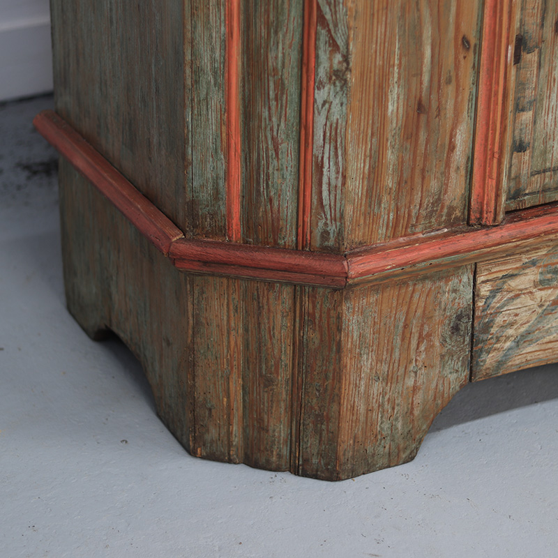 De kast is in haar geheel nagelopen en professioneel gerestaureerd, met oog op originaliteit en karakter. De constructie is solide, de beschildering mooi intact en het patina is behouden. De kast heeft een origineel werkend slot en is aan de binnenzijde voorzien van een legplank en roede. Deze roede, en één van de twee wiggen om de kast te demonteren is ooit vervangen. Oude, sporadisch aanwezige houtworm sporen zijn nagelopen en behandeld.
