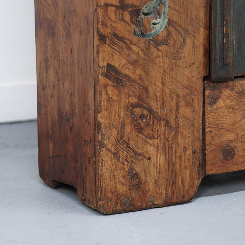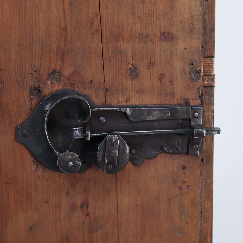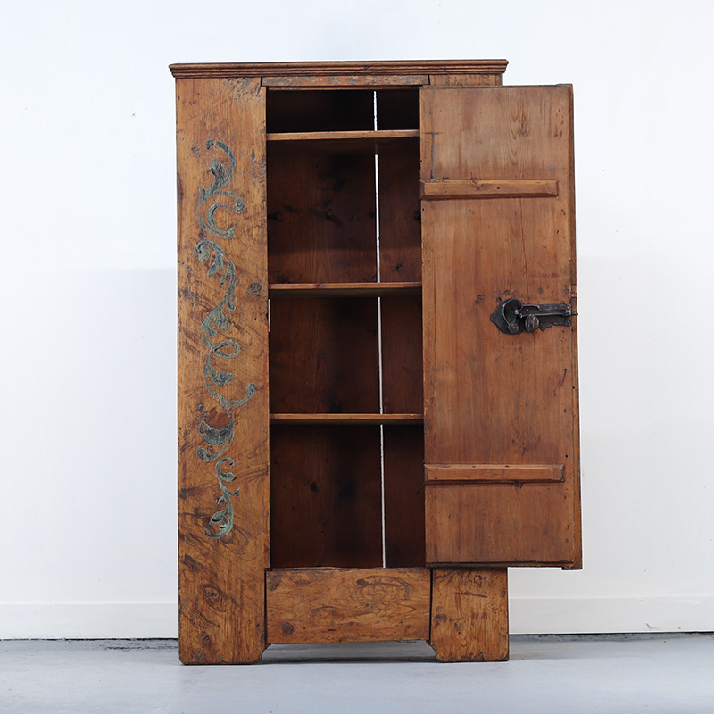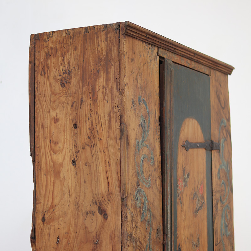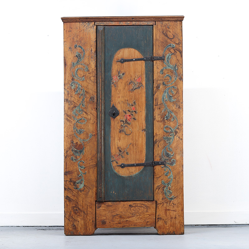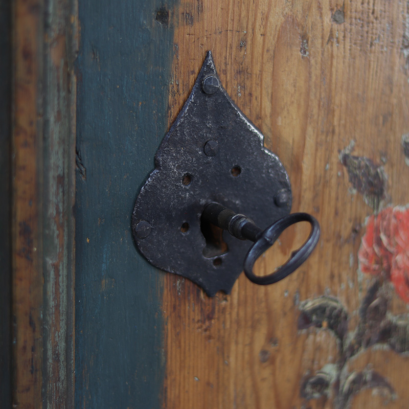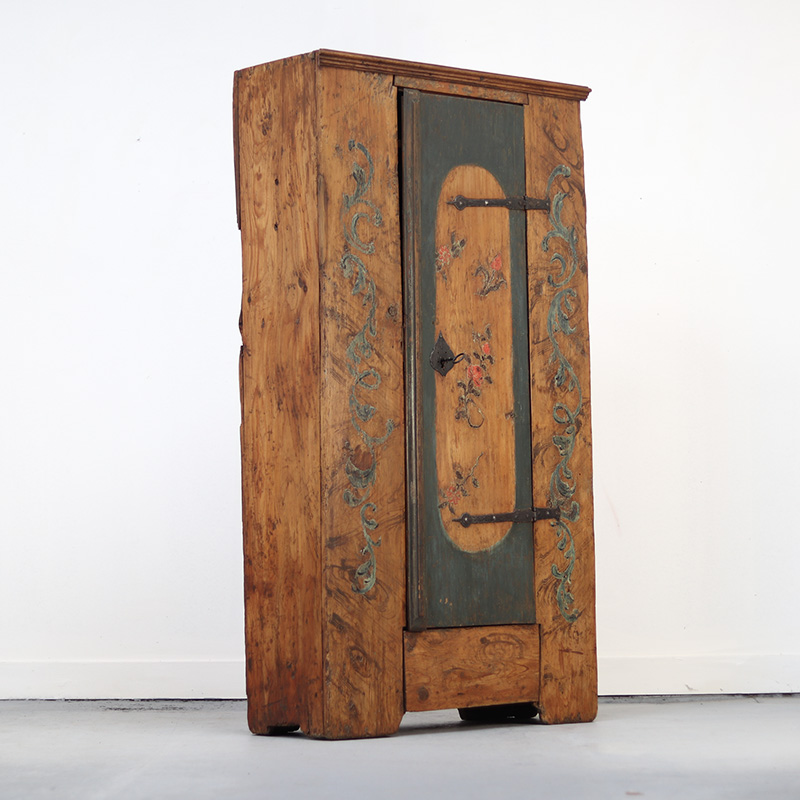 Antieke bruidskast welke omstreeks 1725-1750 dateert uit Franken, Zuid-Duitsland. Het zware geleefde karakter en de originele beschilderingen geven het geheel een waanzinnige uitstraling. Zowel de vormgeving van de kast als de beschildering is eenvoudig en primitief, maar authentiek en een typisch voorbeeld van volkskunst uit de streek. Zo is de kast gedecoreerd met bloemen en acanthus bladeren. Het oude, handgesmede beslag is minstens zo decoratief.