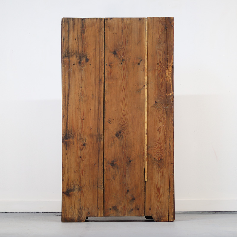 De kast is in haar geheel nagelopen en professioneel gerestaureerd, met oog op originaliteit en karakter. De constructie is solide, de beschildering is gesleten maar geconserveerd en het patina is behouden. De indeling bestaat uit kapstokhaken, één originele en twee later toegevoegde legplanken. De kast is af te sluiten met het originele werkende slot. Oude, sporadisch aanwezige houtworm sporen zijn nagelopen en behandeld.