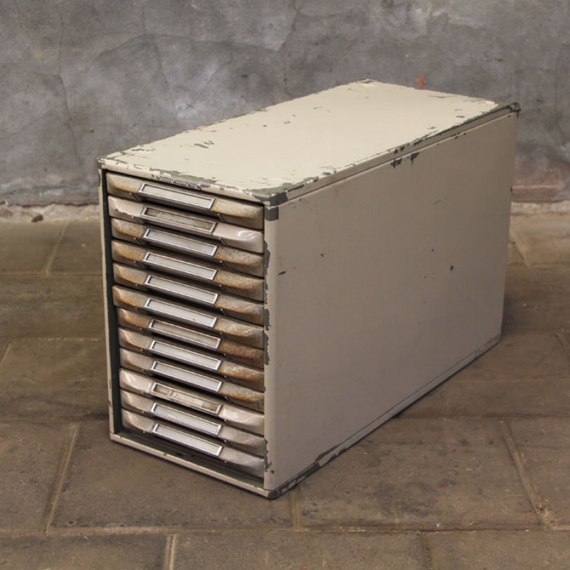 Industriƫle ladekast / archiefkast van Remington. Van staal en in de oude verf. 12 laden met etikethouders. Zware, degelijke kwaliteit. 40cm hoog, 27cm breed, 64cm diep. Ophalen in Gilze.