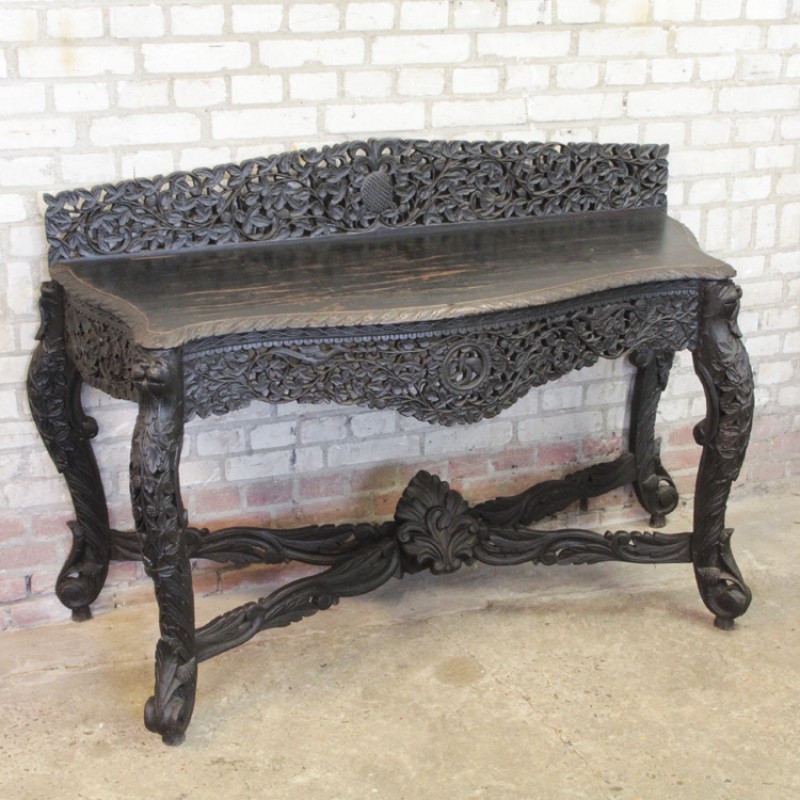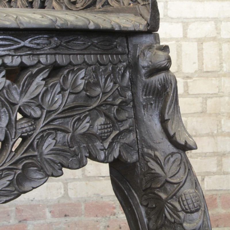 Uiterst unieke koloniale Engelse sidetable. Het geheel is van een donker tropisch hardhout vervaardigd en is prachtig met houtsnijwerk gedetailleerd. Spuwende leeuwenkoppen zijn op de poten afgebeeld, de rest is versierd met bladeren en fruit. Aan de achterzijde een opgezette kuif, de versieringen op de voetbalken en het ornament in het midden hebben echter weer typerende Franse invloeden. Het blad vertoond lichte slijtage plekken. Herkomst (vermoedelijk) Myanmar / Birma, eind 19e eeuw.