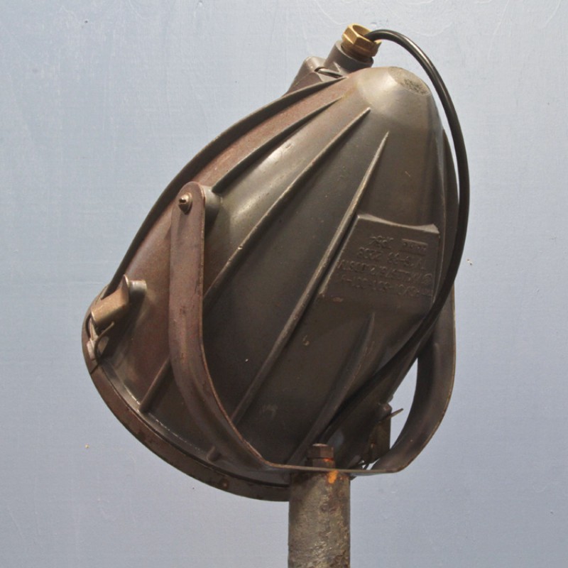 Oude industriële metalen lamp op houten statief. Het statief is in